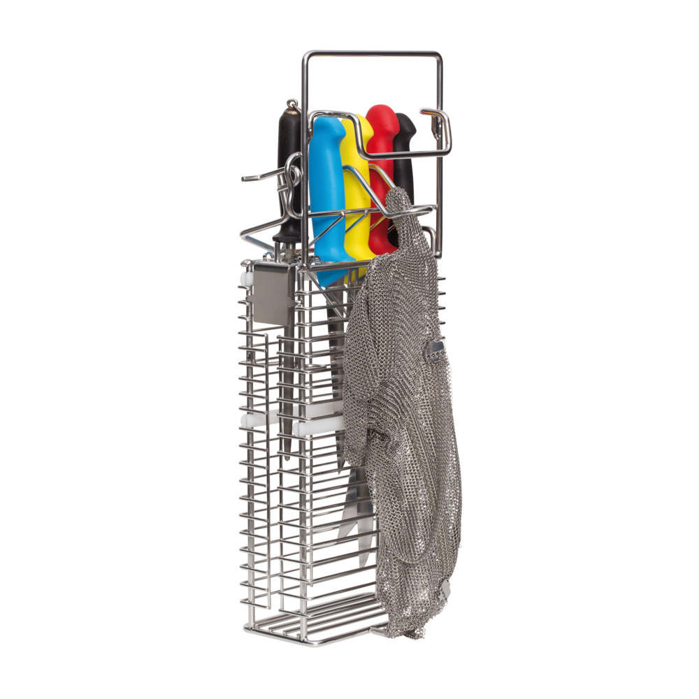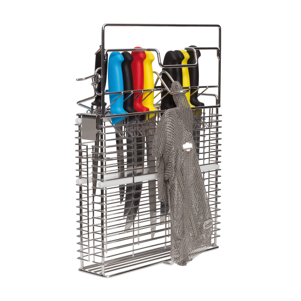 Hochwertiger Messerhalter aus Edelstahl zur hygienischen Aufbewahrung von Messern, 2 Wetzstählen und Kettenhandschuh. Mit Kunststoffeinsätzen als Klingenschutz. Abschließbar mit Vorhängeschloss. Höhe ca. 50 cm. (Lieferung ohne Messer und Zubehör)