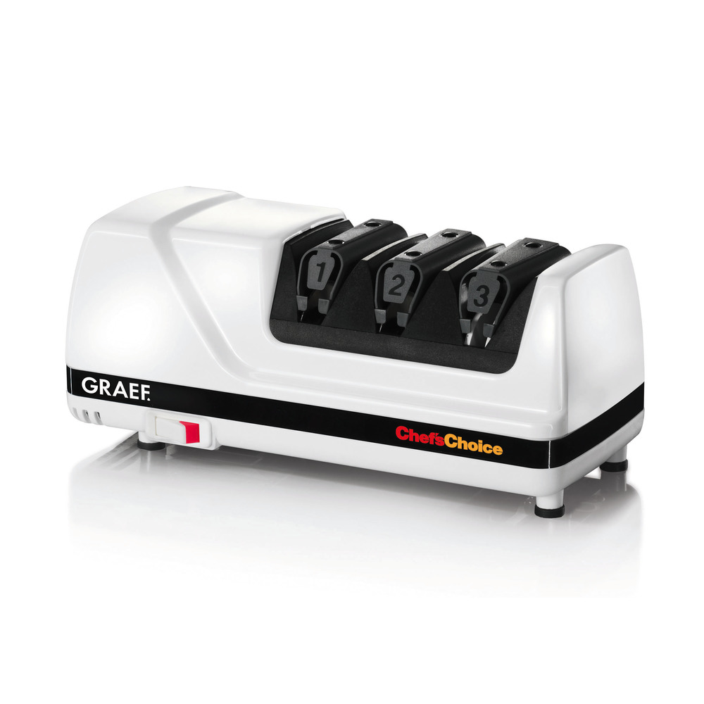 Hochleistungsmotor 230 V, 3-Stufen-Winkelschliff: „Vorschärfen , „Schärfen , „Abziehen , für alle glatten und gezahnten Haushalts- und Gewerbemesser, diamantbeschichtete Schleif- und Keramikscheiben.