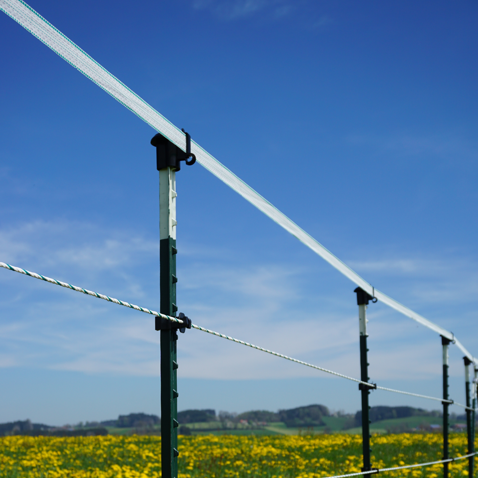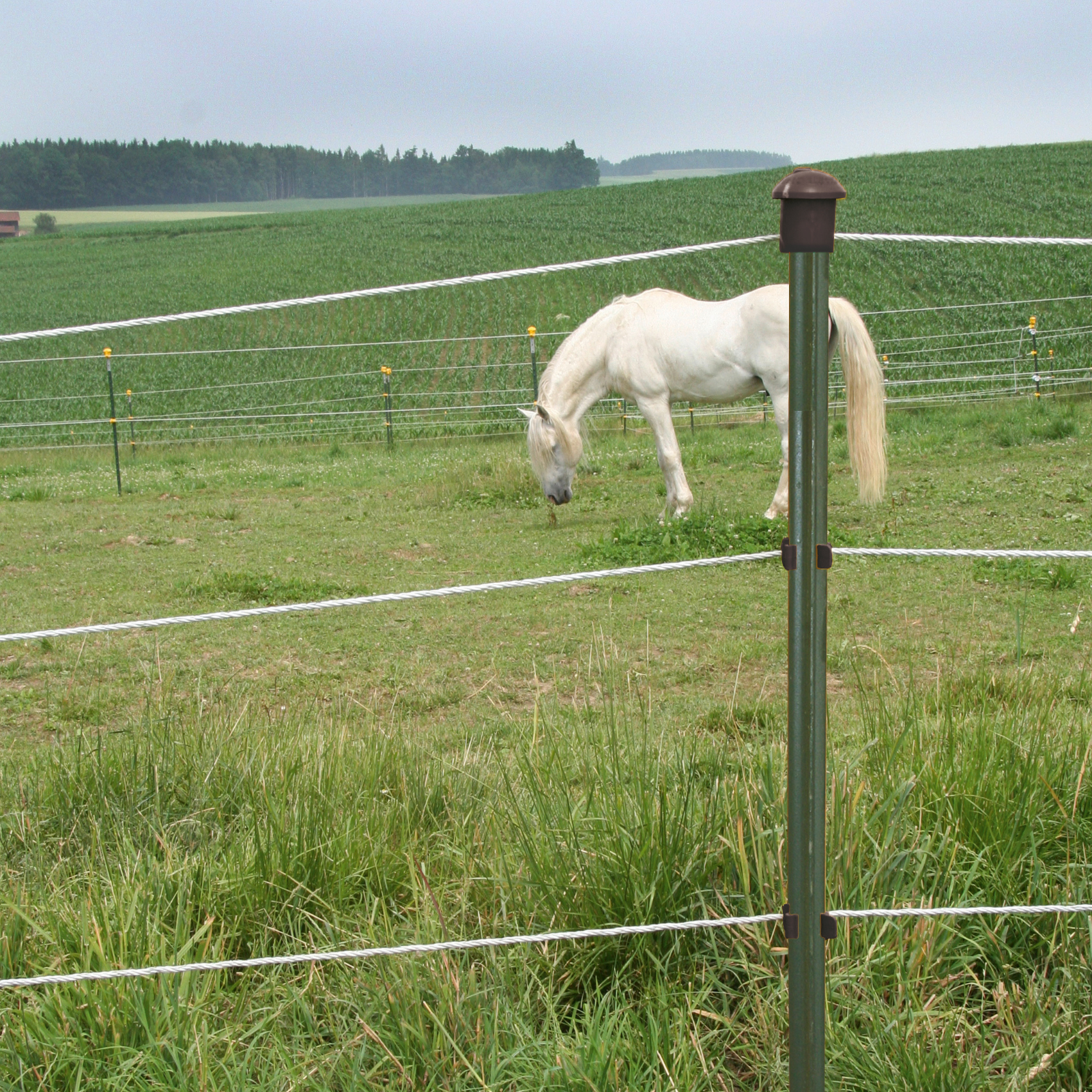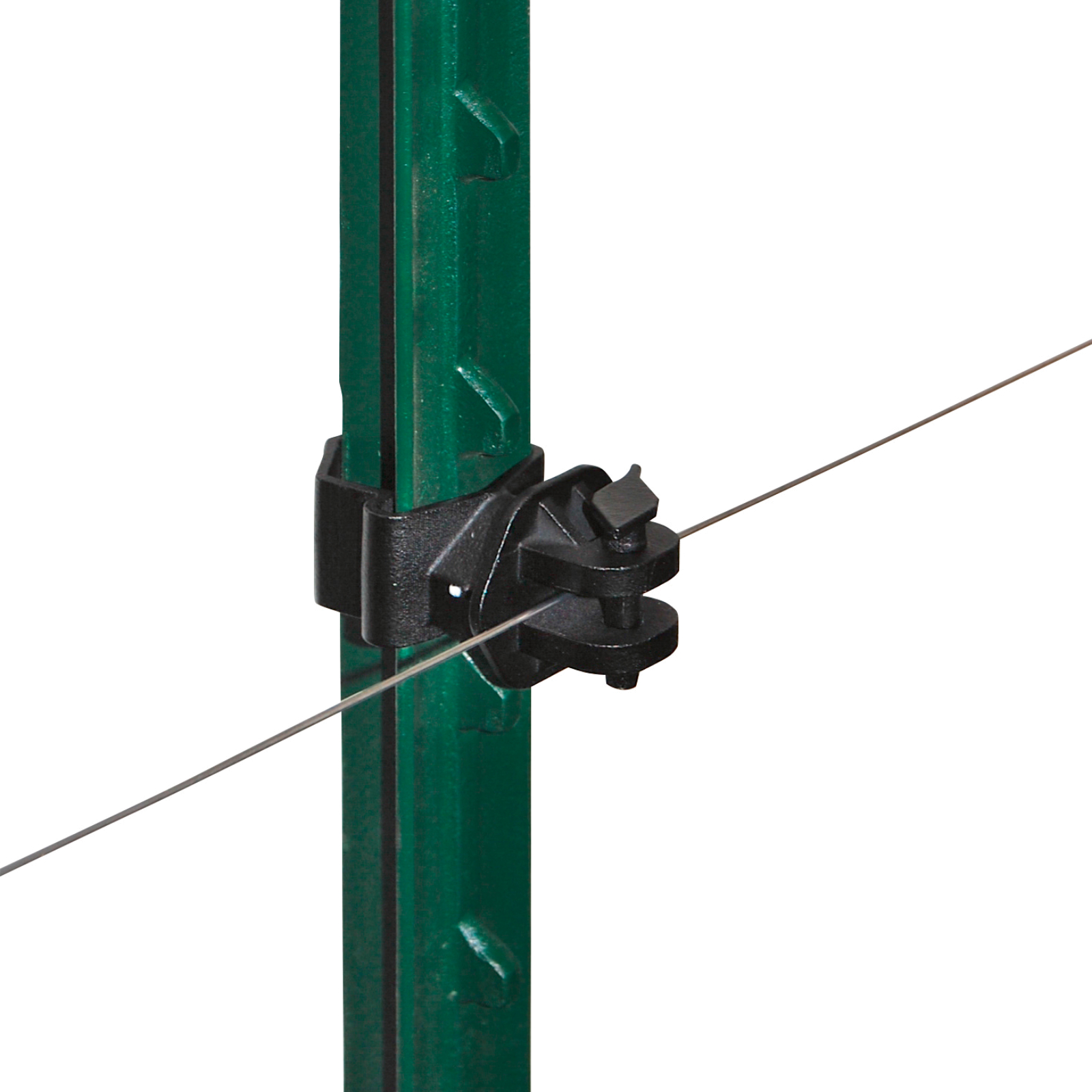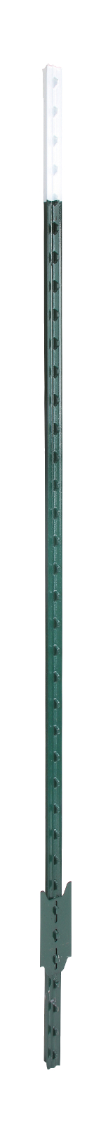 T-Pfahl aus stabilem Schienenstahl. Massive Fußplatte, Einschlagtiefe ca. 40 cm. Ideal für Pferde-, Rinder und Wildzäune. Farbe grün mit weißer Spitze.