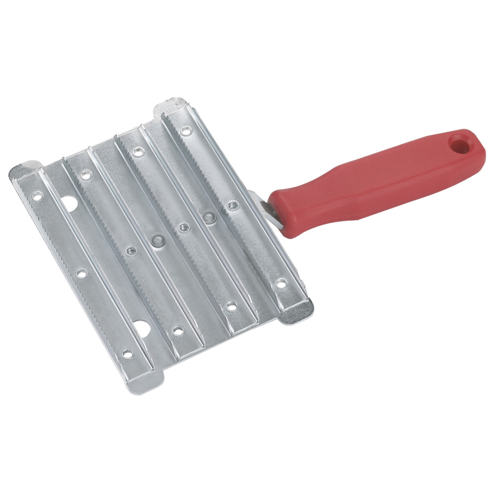 Verzinkt, 3-reihig, mit 2 Abklopfeisen, Kunststoffgriff, grob gezahnt, besonders für Rinder geeignet; LxB: 10x14,5 cm.