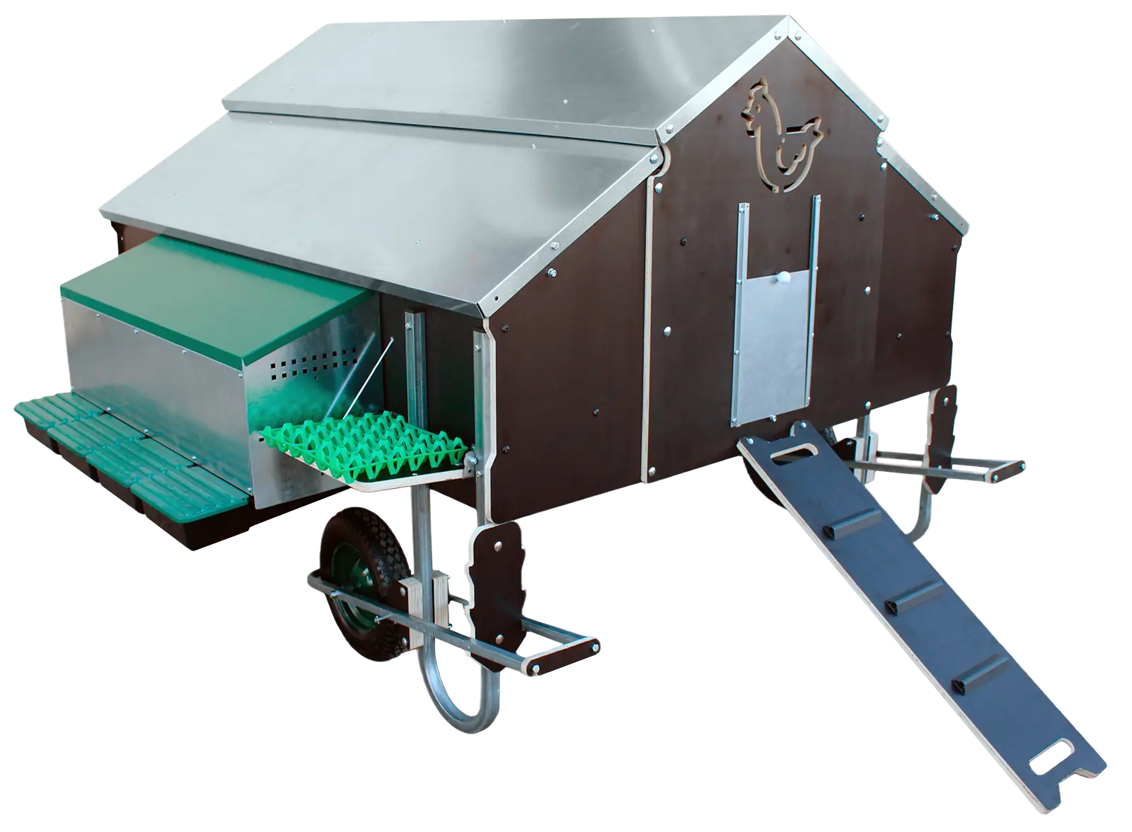 Dieser fahrbare Hühnerstall für den Außenbereich ist die perfekte Lösung für alle, die ihre Hühner einfach und effektiv halten wollen. Durch das integrierte Fahrgestell kann der Hühnerstall leicht an einen anderen Platz verbracht werden, sodass die Hühner wieder ausreichend frisches Futter finden und die Wiesen-/Rasenfläche geschont wird. Geeignet ist dieser Mobilstall für ca. 25 Hühner.Material: Korpus aus Holz (Betoplanplatten ca. 17 mm), Dach aus Blech, Fahrgestell verzinkt. Der Hühnerstall bietet folgende Ausstattungsdetails