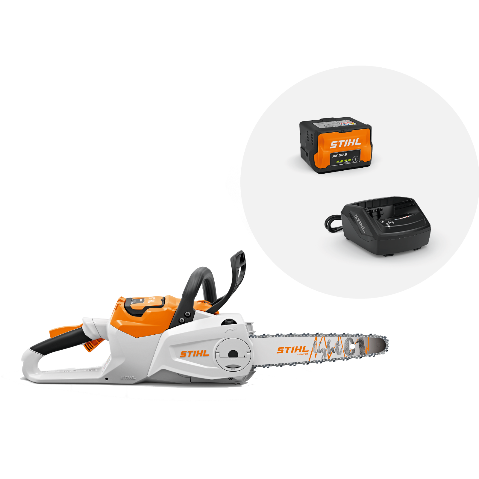 Die STIHL MSA 80 C-B arbeitet mit Akkus aus dem STIHL AK-System und ist dabei so leise, dass Sie die Säge ohne Gehörschutz und in lärmsensiblen Bereichen nutzen können.Set Angebot: direkt mit dem Arbeiten starten! Die Akku-Motorsäge STIHL MSA 80 C-B im Set mit einem Akku STIHL AK 30 S (bis zu 35 Minuten) und dem Standardladegerät STIHL AL 101 (160 Minuten auf 80%).Dank der 35 cm Führungsschiene STIHL Light 01 mit der 1/4 Zoll P Picco Micro 3 (PM3) Sägekette können Sie saubere, glatte Schnitte verlässlich ausführen.