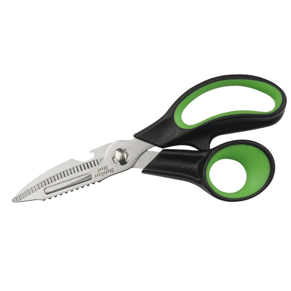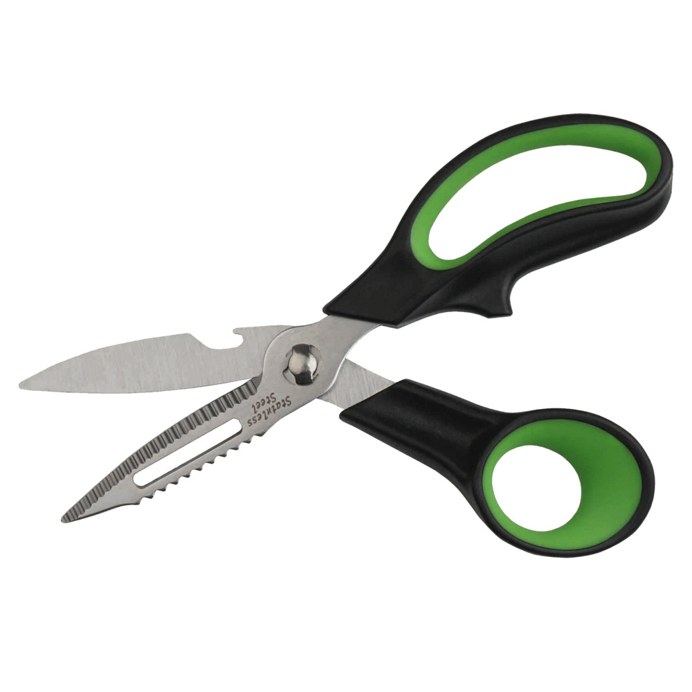 Prakische Universalschere verwendbar für Scheren- und Messerschnitt, als Obst- und Gemüseschäler und Flaschenöffner. Stahlklinge rostfrei, trennbare Klingen zur Verwendung als Messerschnitt. Ergonomisch geformte Griffe, Länge total: 21 cm.