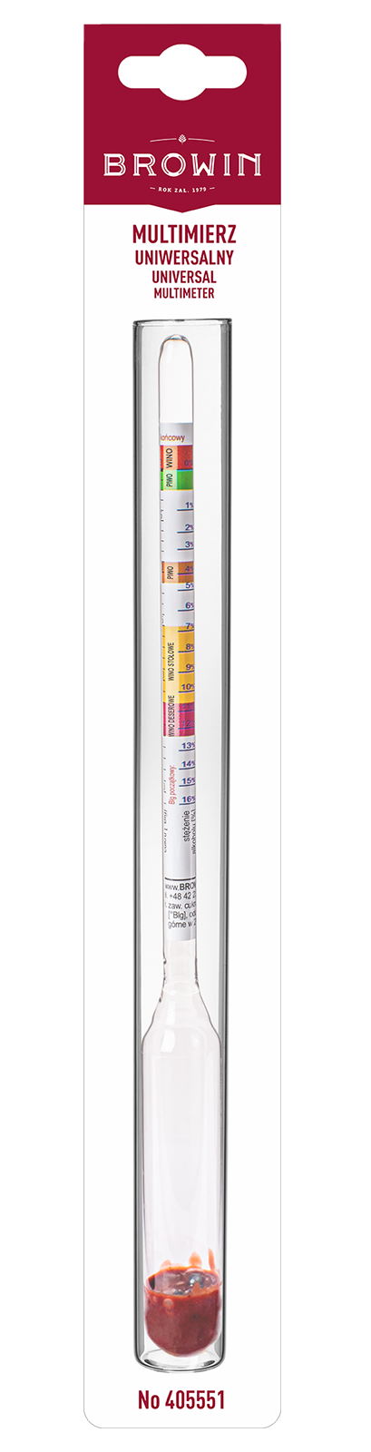 Das Gerät wurde bei einer Temperatur von 20°C geeicht.Mit drei Skalen zur Messung der Zuckerkonzentration in g/l und in Grad Blg sowie der potenziellen Konzentration von Alkohol in % - Röhrchen für die Messung