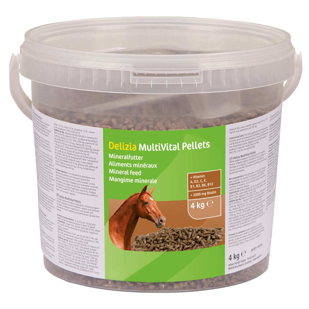 DiesesMultivitalstoffpräparat deckt den Bedarf an Vitaminen, Mineralien und Spurenelementen gerade in Zeiten einer energiereduzierten Ernährung, als auch starker körperlicher Belastung umfassend ab. Durch den Anteil an organisch gebundenen Mineralstoffen ist die Verwertbarkeit bei diesem Mineralfutter besonders hoch. MultiVital Pellets kräftigt die vitale Widerstandskraft des gesamten Organismus. Es unterstützt und optimiert Kreislauf, Stoffwechsel, Fruchtbarkeit und Wachstum. MultiVital Pellets steigert so das Wohlbefinden und das Leistungsvermögen des Pferdes.Qualität aus Bayern!Fütterungsempfehlung: Täglich 10 bis 20 g je 100 kg KörpergewichtInhaltsstoffe: Vitaminen A, D3, E, C, B1, B2, B6, B12; Nikotin-, Fol- und Pantothensäure und wichtige Spurenelemente wie Biotin, Eisen, Zink, Jod usw.Inhalt: 4 kg