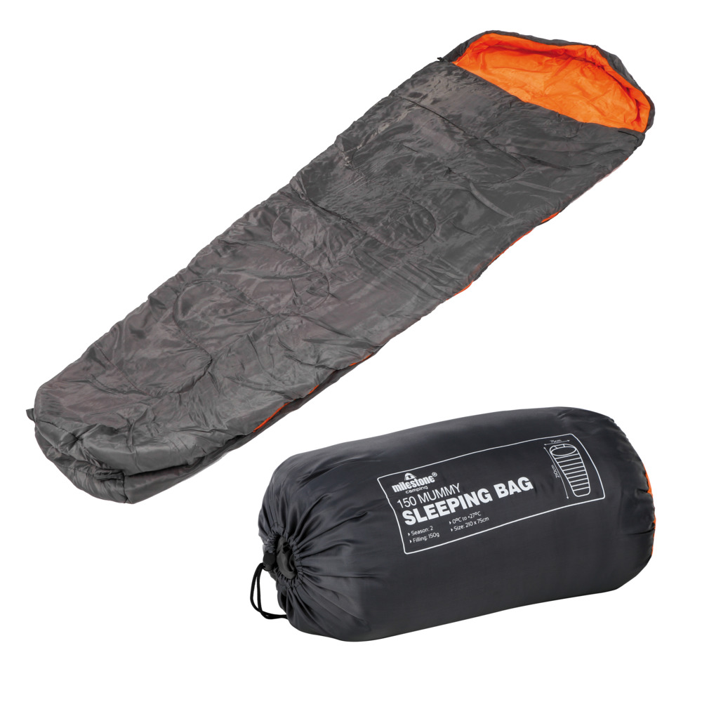 Warmer Mumienschlafsack mit Füllung aus 150 g/m² Hohlfaser. Material außen und innen: Polyester. Maße: ca. 210x75/35 cm.