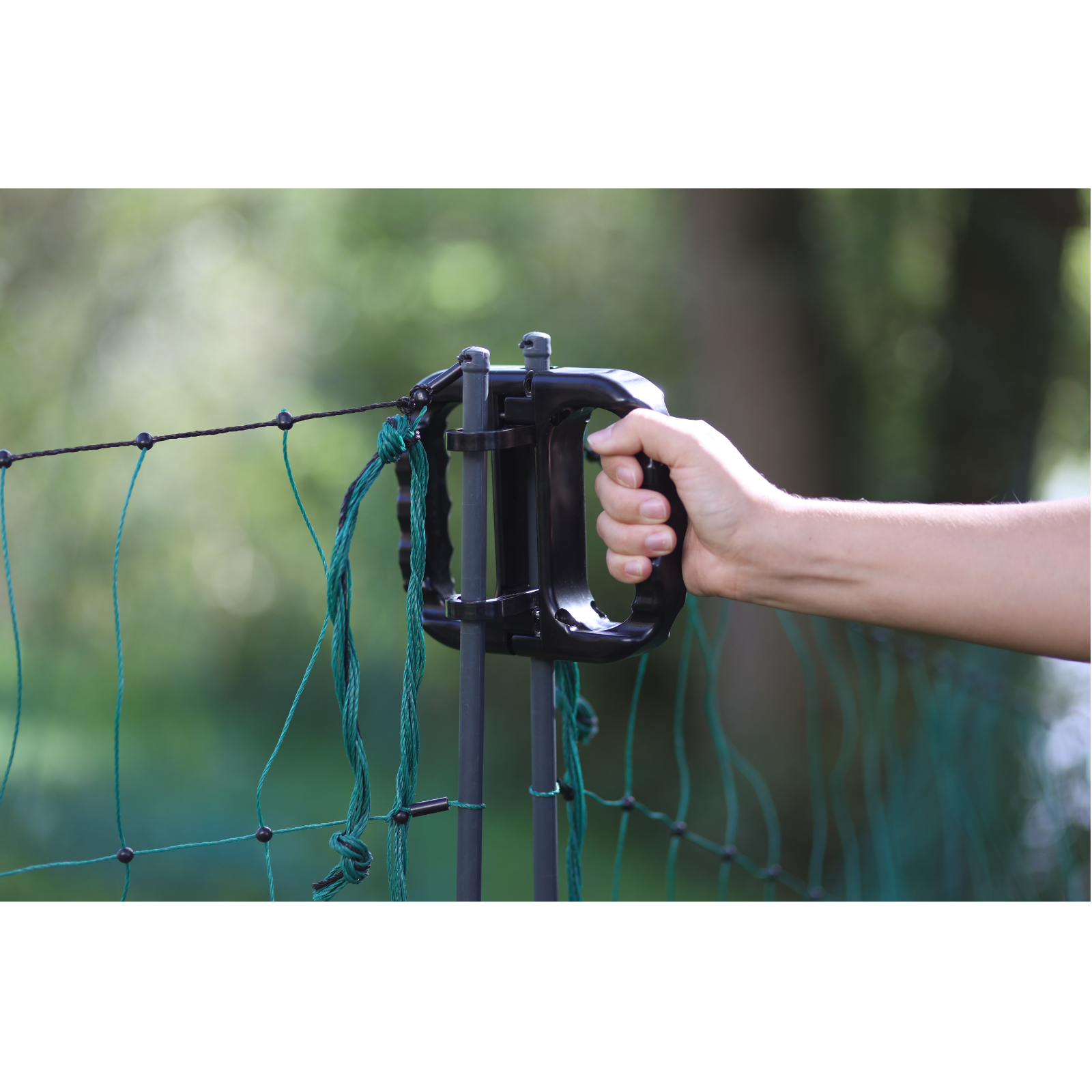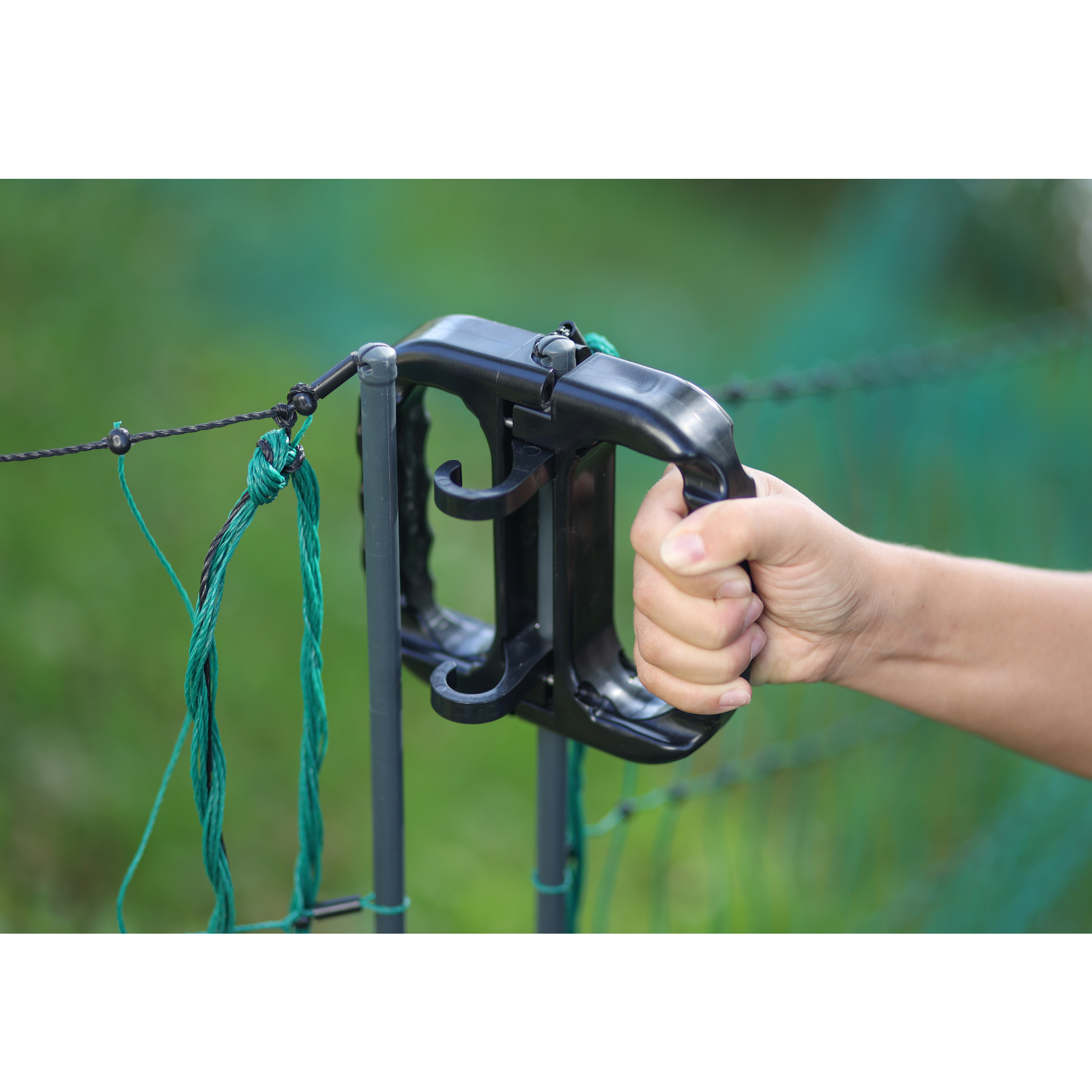 - ist das Netz elektrifiziert, muss der Strom nicht abgestellt werden, um die Weide zu betreten bzw. um zu Ihren Tieren zu gelangen: der extrem robuste und großzügige Griff erlaubt es, durch den Durchgang im Zaun zu gehen ohne die Elektrifizierung vom Netz zu nehmen