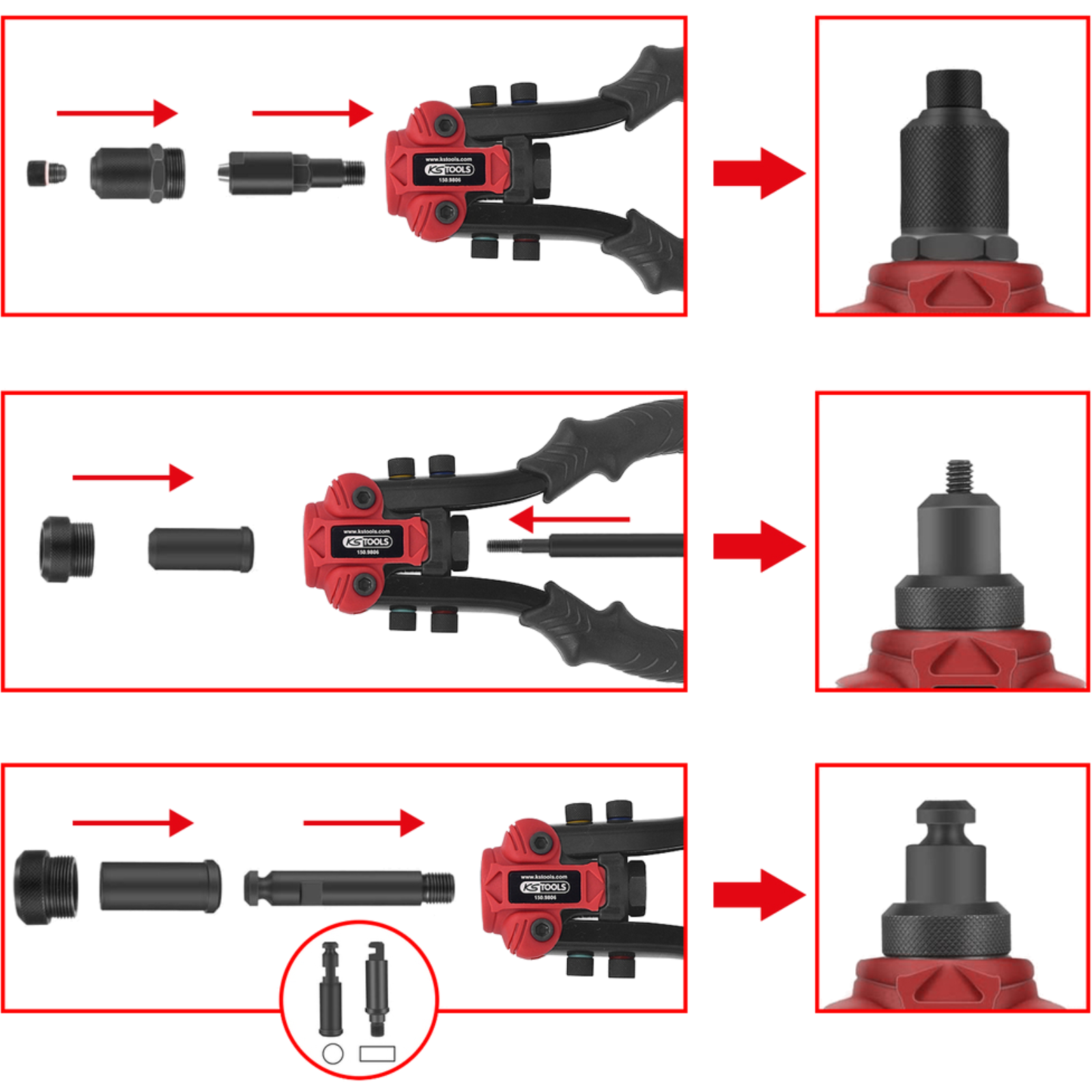 • inklusive 5 auswechselbaren Mundstücken und 6 auswechselbaren Nietmutternzugdornen