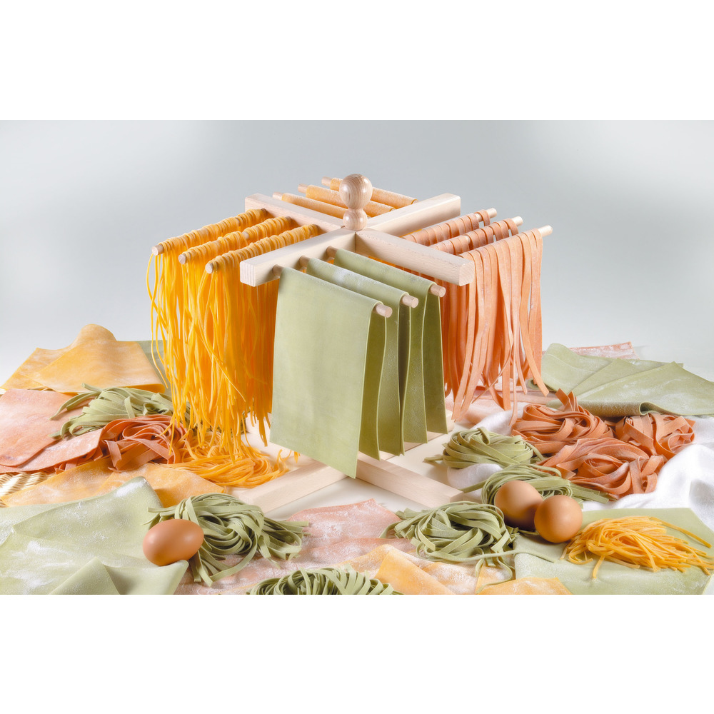 Der Nudeltrockner aus Buchenholz ist ein unverzichtbares Küchenutensil für alle, die gerne ihre eigenen Nudeln herstellen. Mit diesem hochwertigen Nudelständer können Sie Ihre frisch zubereiteten Nudeln schonend und effizient trocknen lassen, bevor Sie sie kochen.Der Nudeltrockner besteht aus unbehandeltem Buchenholz, das umweltfreundlich und hygienisch ist.Der Nudelständer hat eine kompakte Größe und passt problemlos auf Ihre Arbeitsfläche. Nach Gebrauch können Sie die Füße abnehmen und den Trockner platzsparend verstauen.Die 8 abnehmbaren Arme bieten ausreichend Platz, um Ihre Nudeln gleichmäßig zu verteilen. So verhindern Sie, dass die Nudeln zusammenkleben oder verklumpen. Egal ob Tagliatelle, Fettuccine oder andere Sorten – hier können Sie Ihre selbstgemachten Nudeln perfekt trocknen lassen.