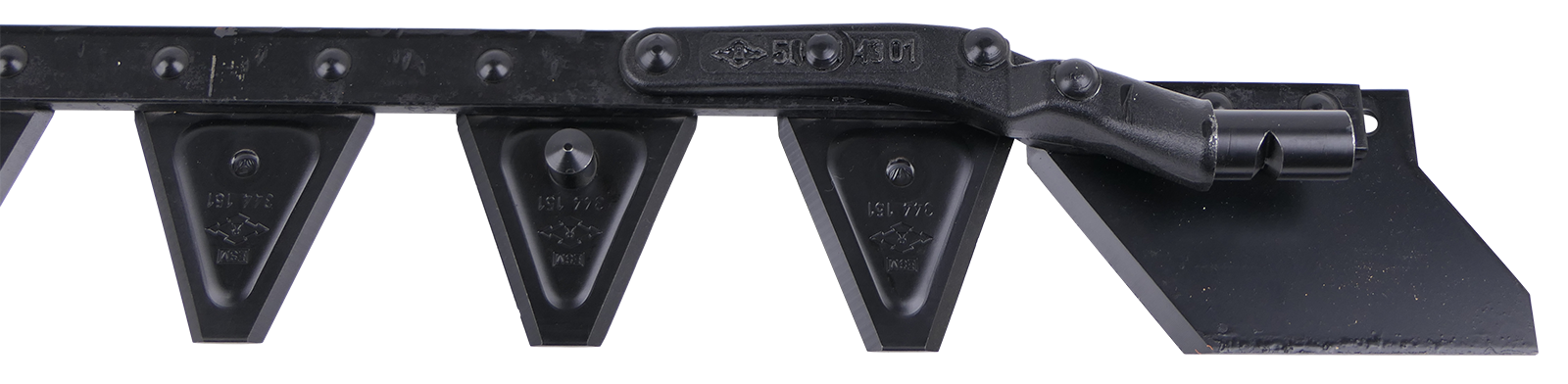 Obermesser zu Doppelmesserbalken Busatis BM 321 KW mit einer Gesamtklingenanzahl von 19 Stück. Davon sind 4 Stk. Klingen mit Pilz zur Aufnahme der Messerführungsarme. Die Positionen der Klingen mit Pilz, ausgehend vom Messerkopf, sind an der 2., 7., 12. und 17. Klinge. Unter dem Obermesserkopf ist eine Messerkopfplatte aufgenietet. Die Teilung der Klingen im Abstand von Klingenmitte zu Klingenmitte ist 76 mm.