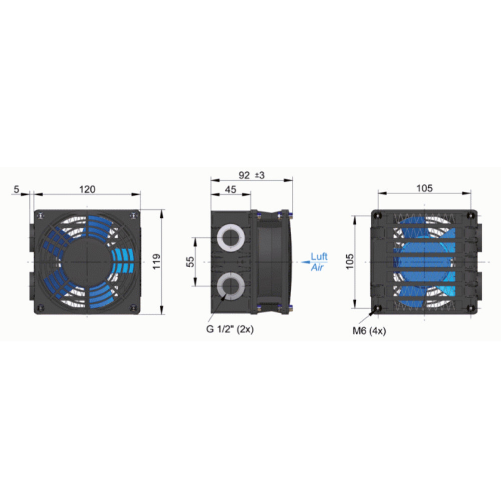 Aluminium-Ölluftkühler in Plattenbauweise. Maximaler Betriebsdruck 26 bar, Schutzart IP68.Ölkühler werden bei Dauerbetrieb von hydraulischen Anlagen zur Abkühlung des Hydrauliköls eingesetzt. Vorwiegend werden Ölkühler jedoch auf solchen Anlagen montiert, die nachträglich mit weiteren hydraulischen Verbrauchern ausgerüstet wurden. Bei diesen Umbauarbeiten wird in vielen Fällen der Tankinhalt nicht vergrößert und dadurch erhöht sich der Umlauf und die Temperatur des Öles im Hydrauliksystem. Die optimale Betriebstemperatur einer Hydraulikanlage liegt zwischen 50-60°C. Erhöht sich die Temperatur zu stark, muss die überschüssige Wämemenge über einen ÖL/Luftkühler abgeführt werden.Um die Größe des Ölkühlers festlegen zu können, benötigen wir für die Berechnung einige Daten von Ihnen:- Zahnradpumpe oder Regelpumpe- Fördermenge der Pumpe in L/min- Tankinhalt in L (wenn bekannt)- Öldruck im Hydrauliksystem in bar- Umgebungstemperatur in °C- Öltemperatur der Hydraulikanlage in °C- Anschlussspannung in VWir berechnen gerne für Sie den benötigten Ölkühler und freuen uns auf Ihre Anfrage