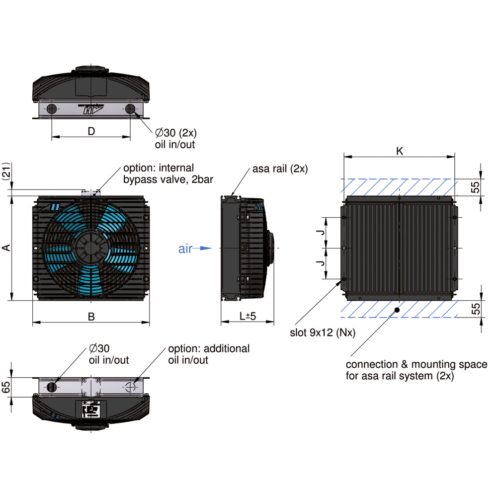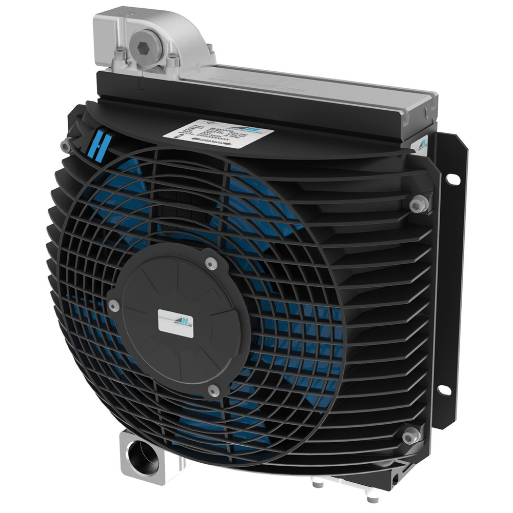 Aluminium Ölluftkühler, max. Betriebsdruck 26 bar, Schutzart IP 68. Weltweit erstes flexibles Montage- und Anschlusssystem für Ölkühler. Die hydraulische Anschlussrichtung ist bei jedem Anschluss mit 3 Richtungen frei wählbar und die Durchflussrichtung im Kühler ist änderbar. Die Ölflussrichtung kann sowohl als "U-Durchfluss" als auch mit "Diagonal-Durchfluss" ohne Sonderteile realisiert werden!Lieferung ohne Anschlüsse.