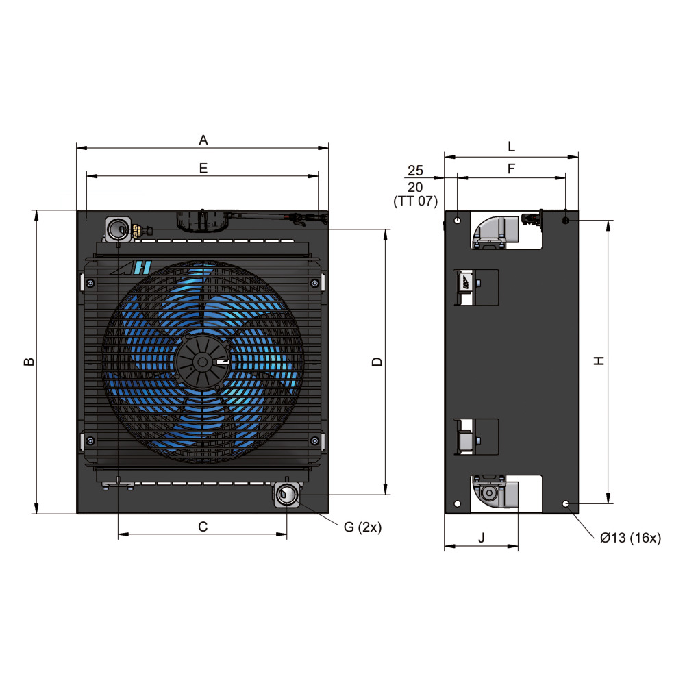 Die Ölkühler der Serie GT sind ein fertig montiertes Kühlerpaket bestehend aus Ölluftkühler, Lüftersteuerung mit Sensor, Anschlüsse, Schwingungsdämpfer und Schutzgehäuse.Die Temperaturkontrolle erfolgt über eine elektronische Regelung in Verbindung mit einem Temperatursensor. Diese Lüftersteuerung sorgt je nach Öltemperatur für die optimale Lüfterdrehzahl und für einen sanften Anlauf des Lüfters. Das reduziert die Geräuschentwicklung und erhöht die Lebensdauer der Lüftereinheit.Das Schutzgehäuse ist ein stabiler Rahmen mit einem Metallschutzgitter vor dem Kühlelement. Der Kühler ist auf den speziellen asa Schwingungsdämpfern in den Schutzrahmen montiert um Schwingungen zu verhindern. Aluminium Ölluftkühler, max. Betriebsdruck 26 bar, Schutzart IP68.