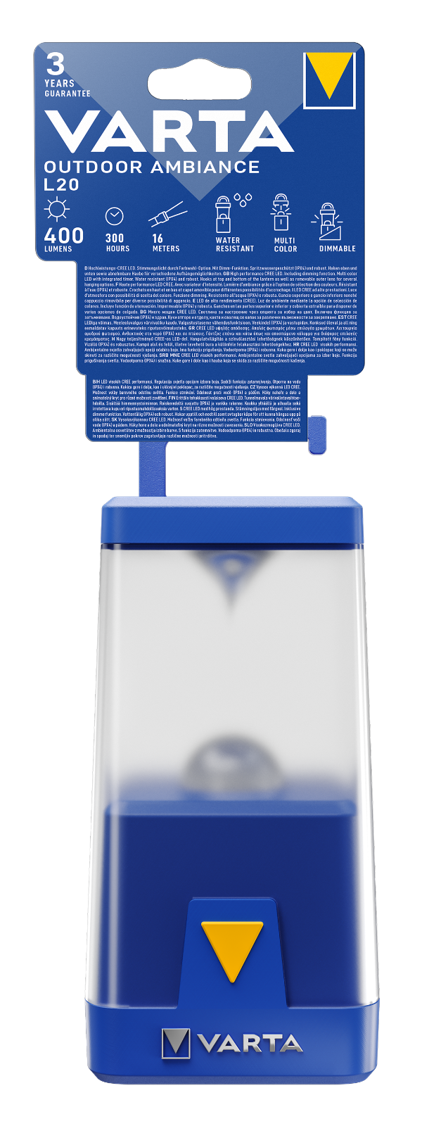 Die VARTA Outdoor Ambiance LED Camping-Laterne L20 ist eine leichte und dennoch robuste (stoßfeste und IPX4 wasserabweisende) Leuchte für perfekte Außenabende mit verschiedenen Farbmodi.Praktische Features für ein ultimatives Outdoor-Erlebnis ohne Limit.Mit ihrer Dimmfunktion und der abnehmbaren Außenlinse für verschiedene Beleuchtungsmodi ist sie ein multifunktionaler Begleiter in jeder Situation. Ob als Campinglaterne mit zwei integrierten Haken für flexible Befestigungsmöglichkeiten oder als stilvolles Accessoire für Sommerabende auf dem Balkon oder der Terrasse unter Verwendung der verschiedenen Farbmodi.3 Jahre VARTA Garantie. Lieferung ohne Batterien.