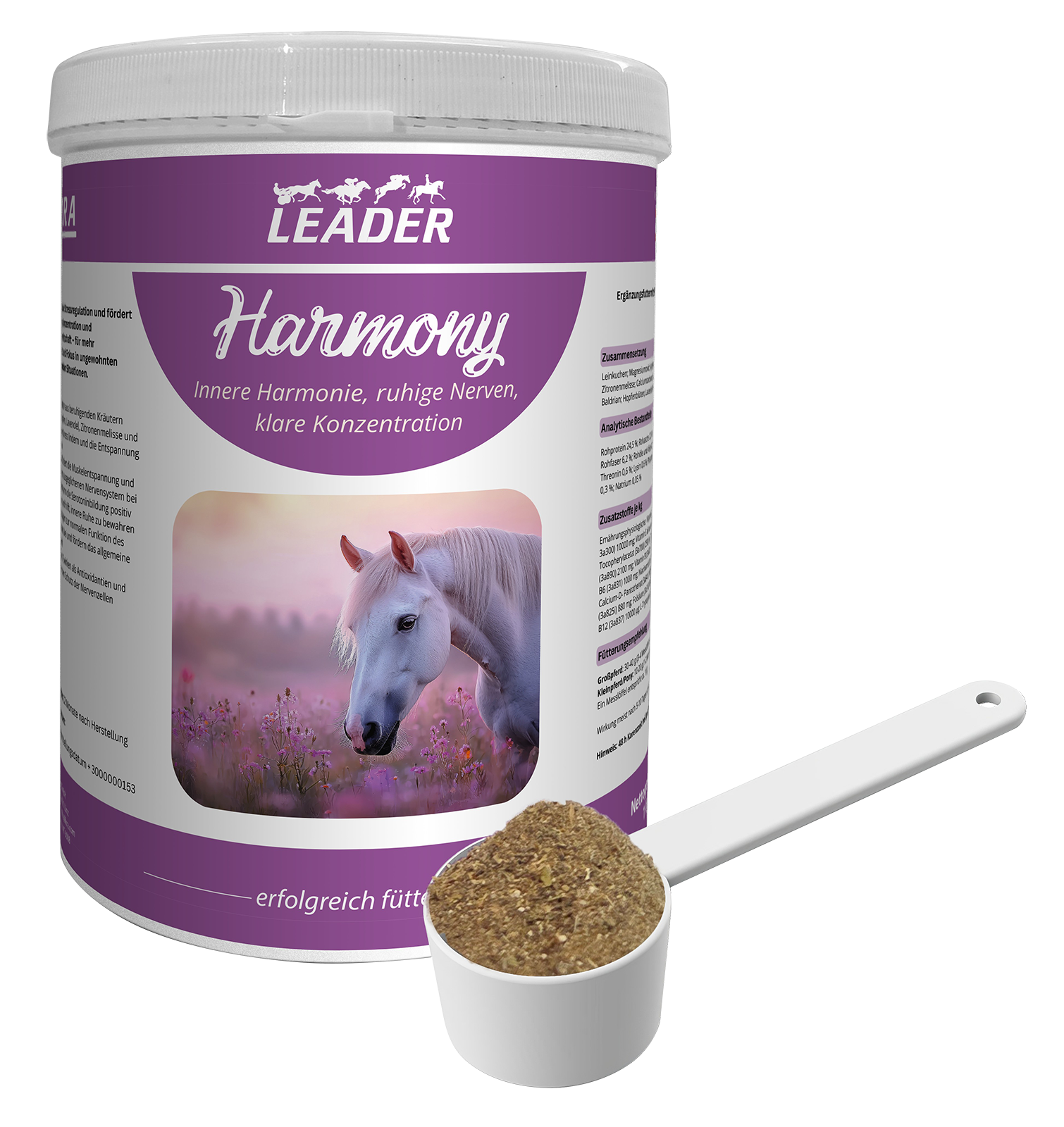 Leader Harmony unterstützt dein Pferd dabei, auch in stressigen oder ungewohnten Situationen – wie Training, Transport oder Stallwechsel – ruhig, konzentriert und ausgeglichen zu bleiben. Mit einer wertvollen Kombination aus Magnesium, L-Tryptophan, B-Vitaminen sowie ausgewählten Kräutern wie Baldrian, Hopfen, Lavendel und Zitronenmelisse fördert Leader Harmony die innere Ruhe, Nervenstärke und das emotionale Gleichgewicht deines Pferdes.