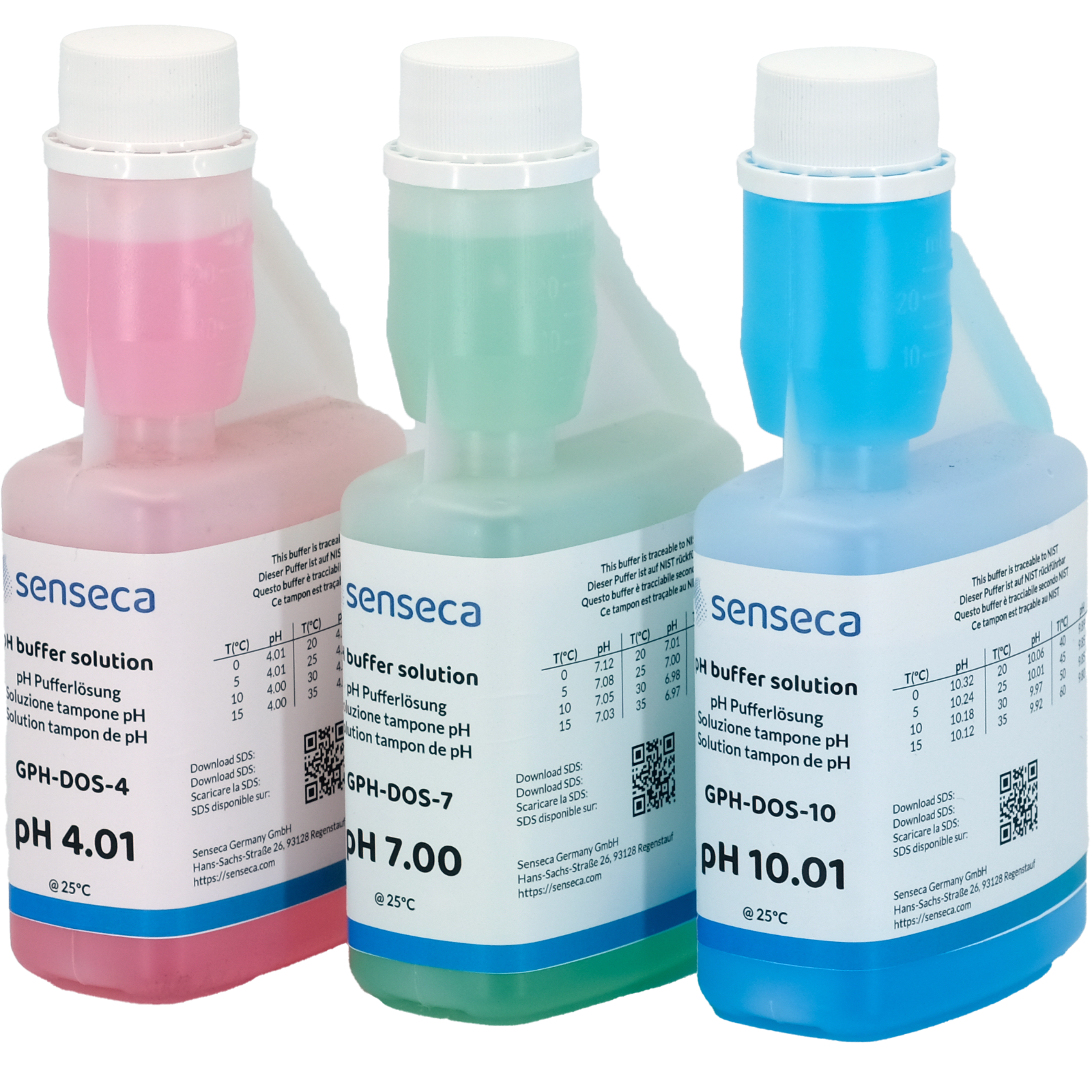 pH-PufferlösungFertige Kalibrierlösung zum Einstellen und Prüfen von pH-Elektroden der Firma Senseca.Wird in einer praktischen 250 ml Dosierflasche geliefert.