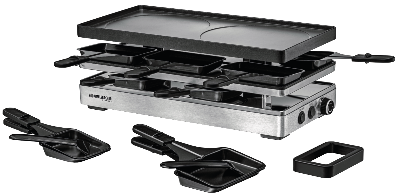 - - als Raclette Grill mit 8 Pfännchen, als Pizza-Station (mit Unterhitze) für 6 Pfännchen,
