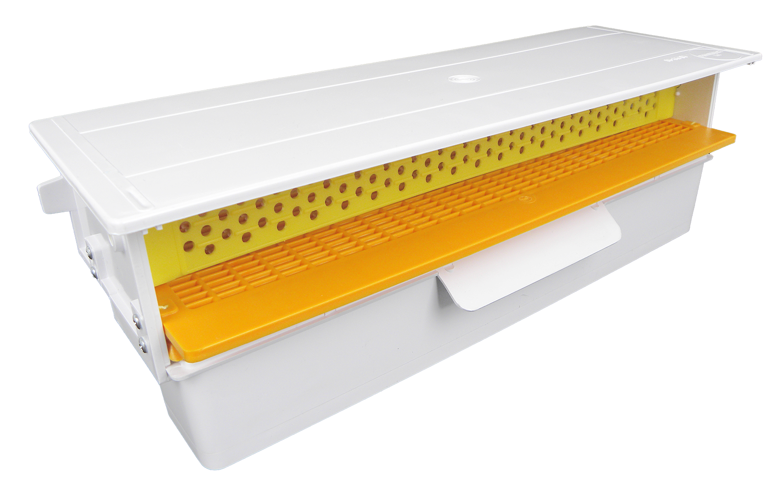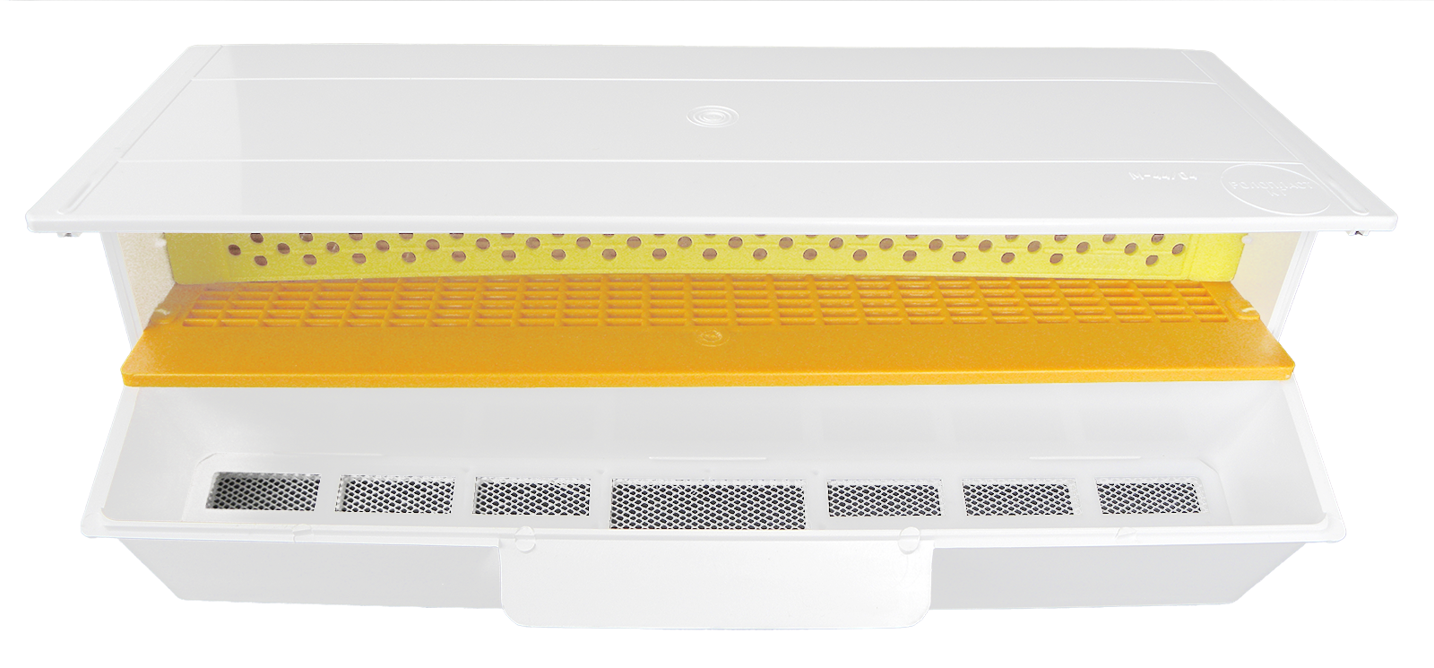Pollenfalle zum vorne Einhängen aus Kunststoff mit hochklappbaren Pollenabsteifkamm.Über eine herausziehbare Schublade kann der gesammelte Pollen einfach entnommen werden.42,6 cm lang bei einer Flugöffnung von ca. 39 cmFarbe kann variieren!