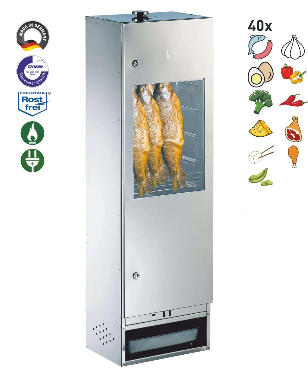 Der Räucherofen Edelstahl mit Tür für ca. 40 Fische mit Fenster ist ideal für alle, die größere Mengen sauber und zuverlässig räuchern möchten.