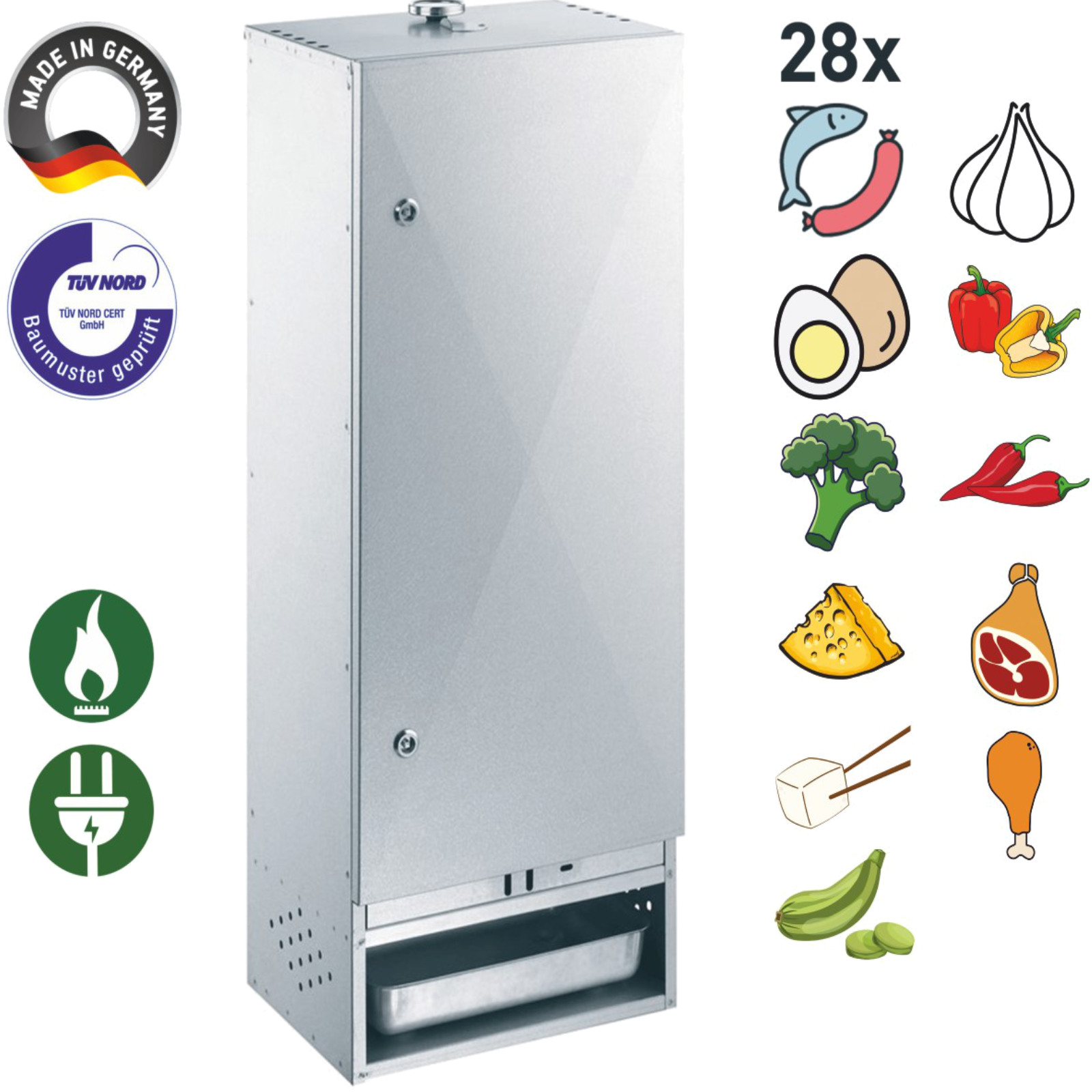 Räuchern, selchen mit Peetz Räucherofenfür bis zu 28 Fische liegend oder hängendgeeignet zum Heiß- und Kalträuchern von Fisch, Fleisch, GeflügelSeitenwände sind doppelwandigAusführung: aluminiertes Stahlblech mit Tür,Gewicht:16,80 kg,Länge:28 cm,Breite: 39 cm,Höhe: 100 cmGrundausstattung (im Räucherofen enthalten):1 Glutkasten1 Tropfwanne1 Räuchermehl-Schale, 1 Thermometer, 2 Roste mit je 4 Stäben zum Senkrechträuchern (Aufhängevorrichtung für Räucherhaken), 1 Beutel Räuchermehl (500g), 1 Vierkantschlüssel1 Räucheranleitung