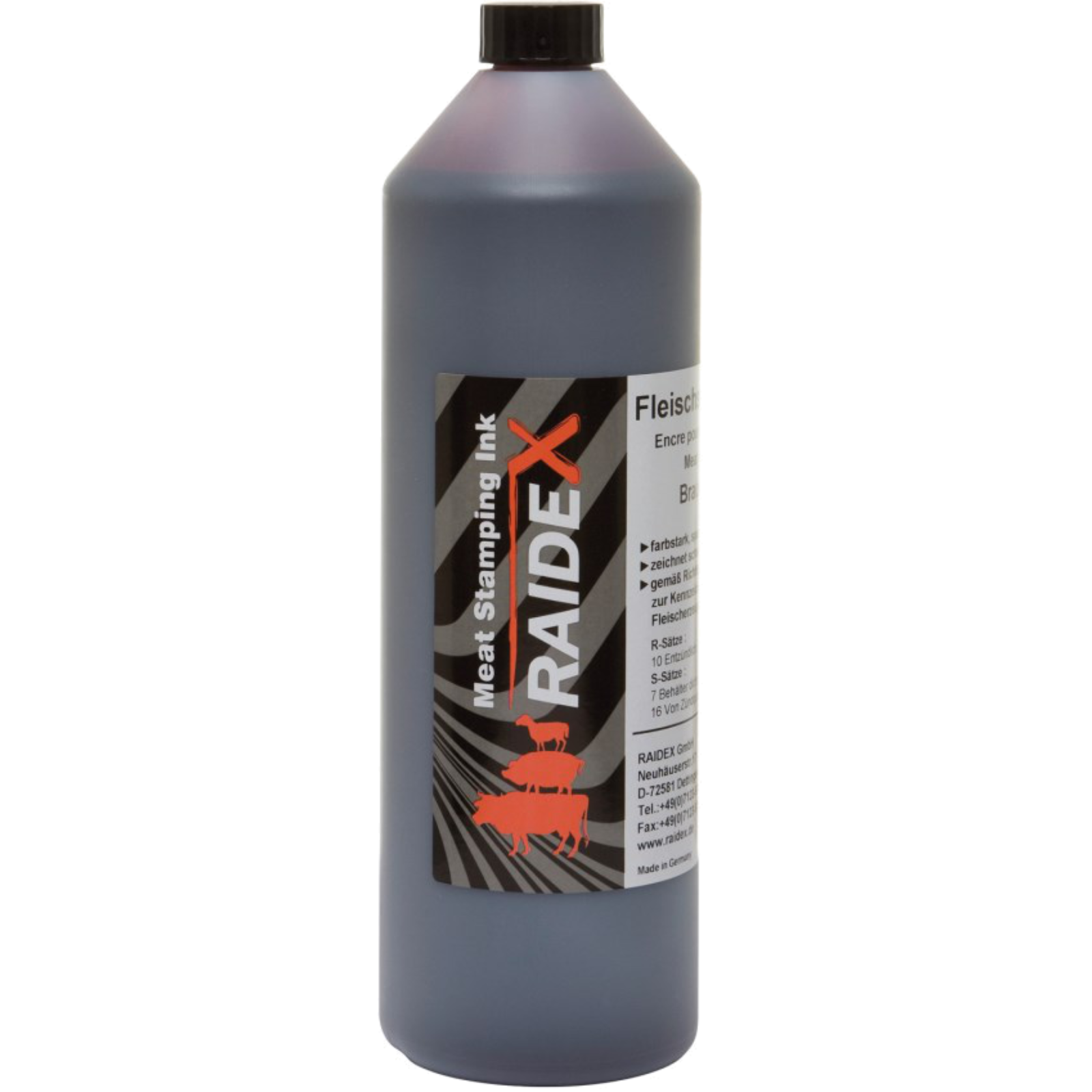 Die RAIDEX Fleischstempelfarbe entspricht der Richtlinie 94/36/EG.Zur Anwendung mit Gummistempeln und Stempelkissen auf rohen Fleischteilen.Farbe: Braun.Flasche 1 LiterAchtung: Die Farbe ist sehr intensiv. Deshalb wird eine sparsame Einfärbung des Stempelkissens empfohlen!