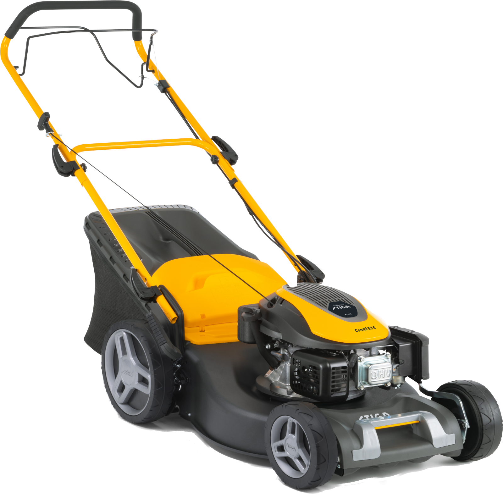 Der STIGA Combi 53 S ist ein selbstfahrender Benzin Rasenmäher mit 51 cm Schnittbreite und 60-Liter-Hybrid-Grasfangkorb mit Fangkorb-voll -Anzeige.