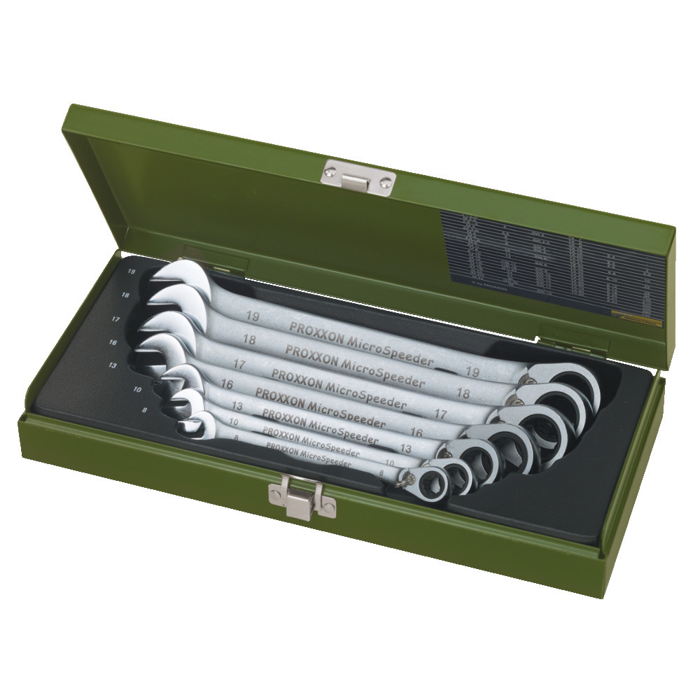 Profi Gabel-Ratschenschlüssel mit Umschaltung. Optimales Arbeiten durch 15° Abwinkelung. Profi Satz mit den Größen 8, 10, 13, 16, 17, 18 und 19 mm. In massiver Metallkassette.