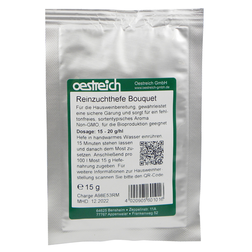 Für die Hausweinbereitung, gewährleistet eine sichere Gärung und sorgt für ein fehltonfreies, sortentypischen Aroma.Dosage: 15 g/hlAnwendung: Die benötigte Menge Reinzuchthefe in handwarmes Wasser einrühren, 15 Minuten stehen lassen und danach dem Most zusetzen. Anschließend pro 100 l Most 15 g Hefenahrung zugeben.