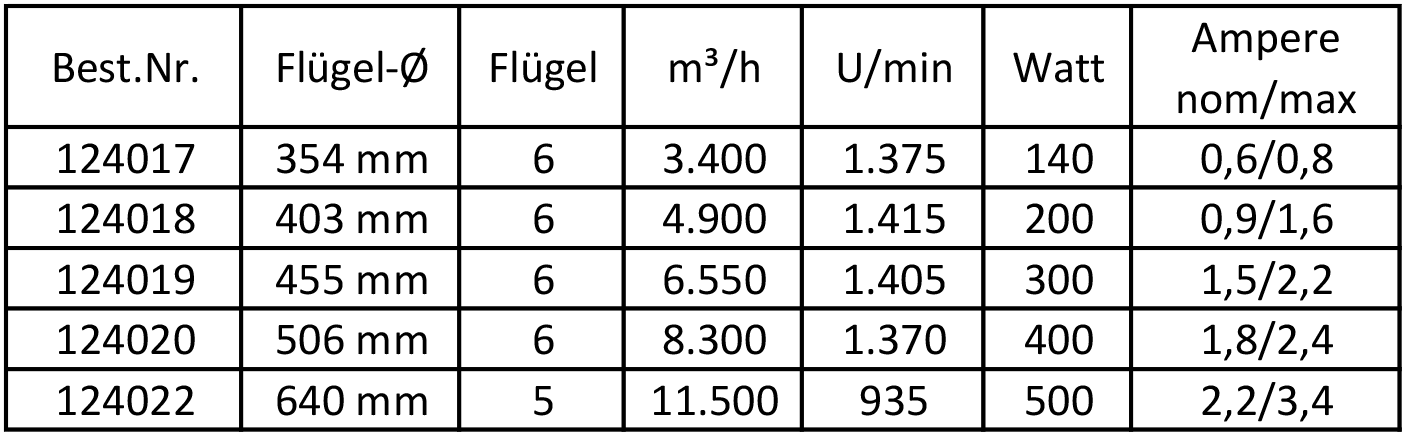 Technische Daten: 230 V, 50 Hz,Umgebungstemperatur -25 bis +40°C,Schutzklasse IP55Elektronisch oder mit Trafo regelbar (frequenzgesteuert auf Anfrage)Maße siehe Tabelle