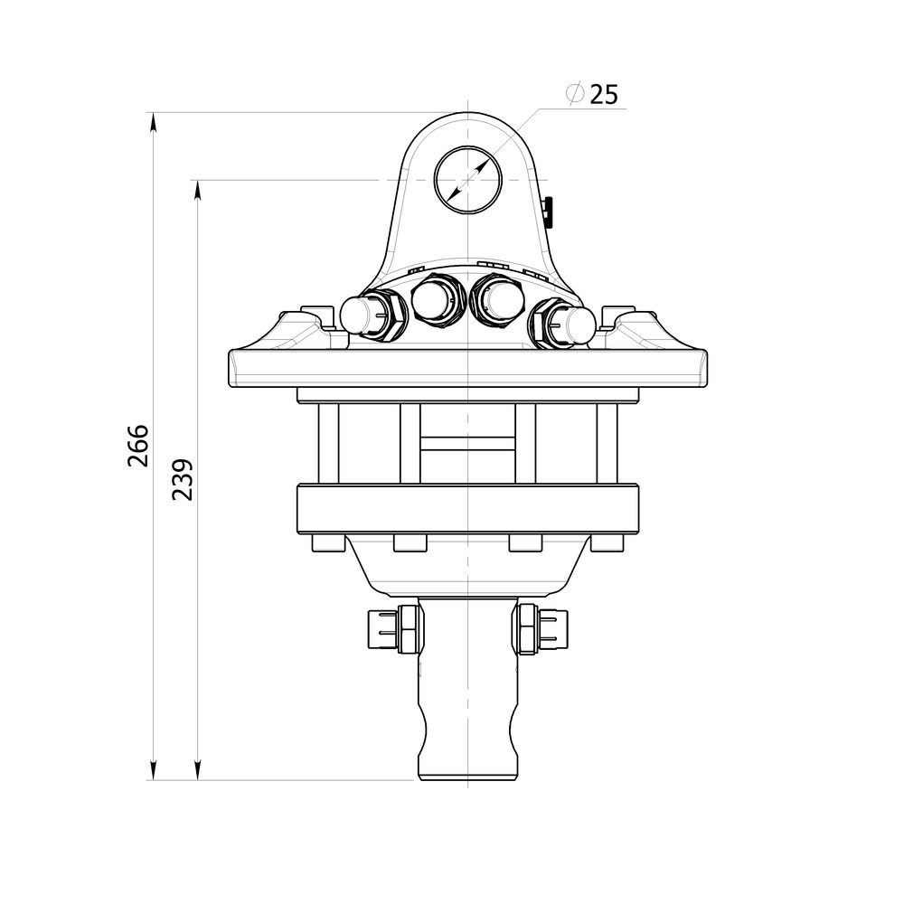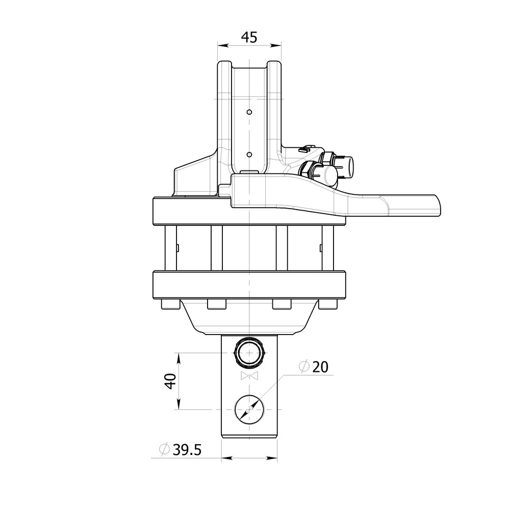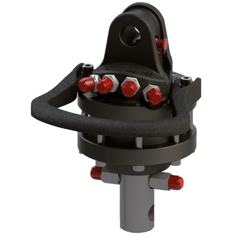 mit 39,5 mm Welle und 25 mm Bohrung, max. Axiallast 1,0 Tonnen (statisch), 350 Nm bei max. 250 bar, max. 300 bar für Greifer schließen, max. 200 bar für Greifer öffnen, erforderlicher Ölfluss 10 Liter/min., Anschluss 1/4 Zoll, endloser Drehbereich, Gewicht 11 kg.