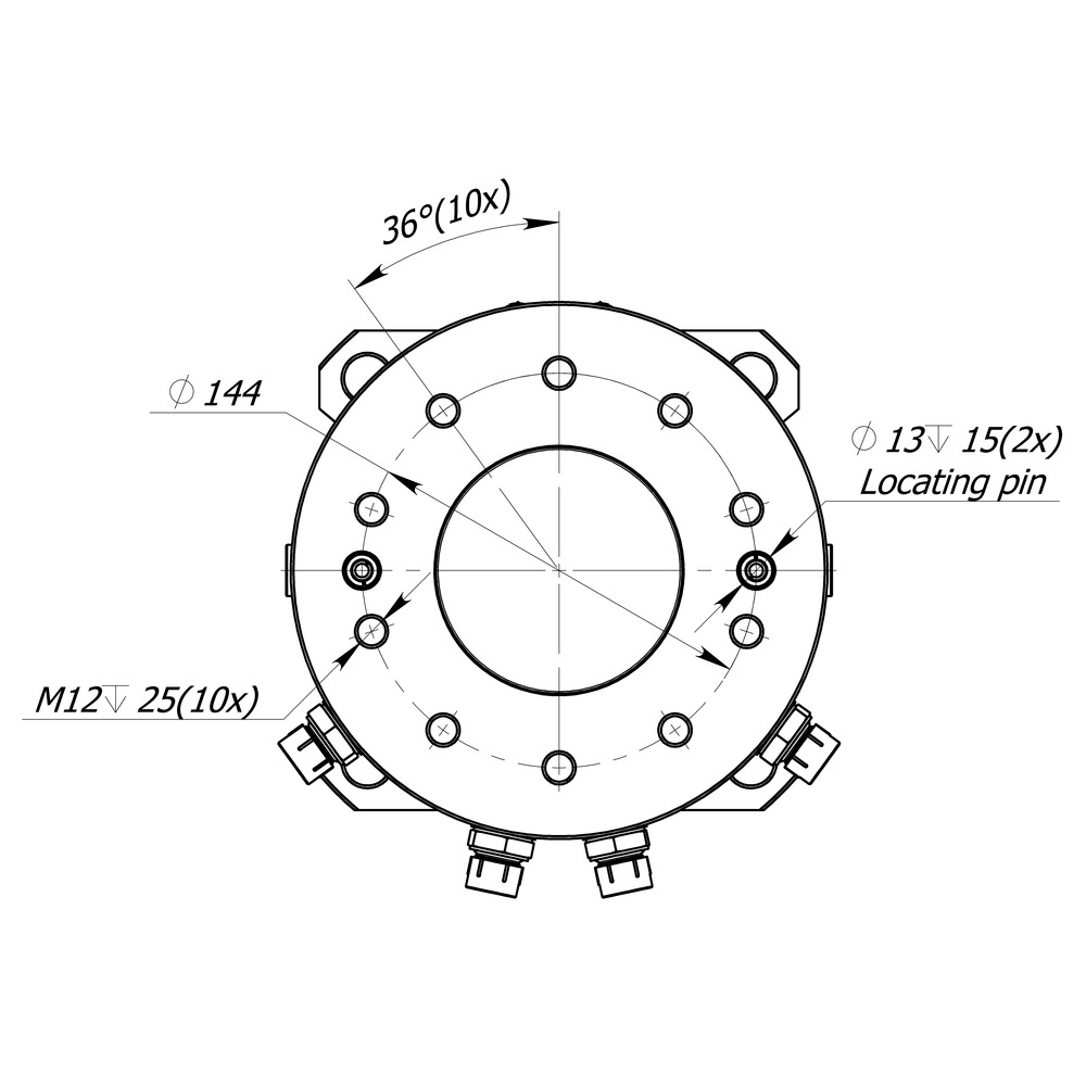 Flansch oben: 10-Loch (M 12 IG) mit Lochkreis 144 mm und zwei Stehbolzen.