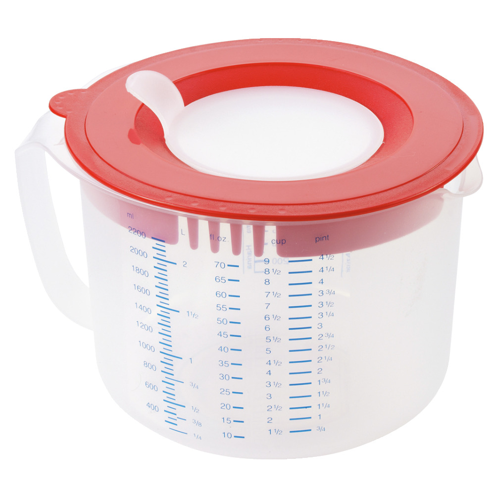 Ein rundum komfortabler Mess- und Rührbecher mit vielen praktischen Details. Der Leifheit Mess- und Rührbecher ist mit einem Spritzschutz ausgestattet, der beim Rühren von Sahne, Cremes etc. dafür sorgt, dass die Küche sauber bleibt. Mit einem weiteren Deckel kann der Spritzschutz komplett geschlossen werden. Hinzu kommt der dreifach verstellbare Sieb-Ausguss, der ein dosiertes Ausgießen ermöglicht. Durch die Messskalen für Mehl, Zucker und Flüssigkeiten können die Zutaten schnell und zuverlässig abgemessen werden. Mit gummierten Boden für einen sicheren, rutschfesten Stand. Fassungsvermögen: 2,2l Garantie: 3 Jahre