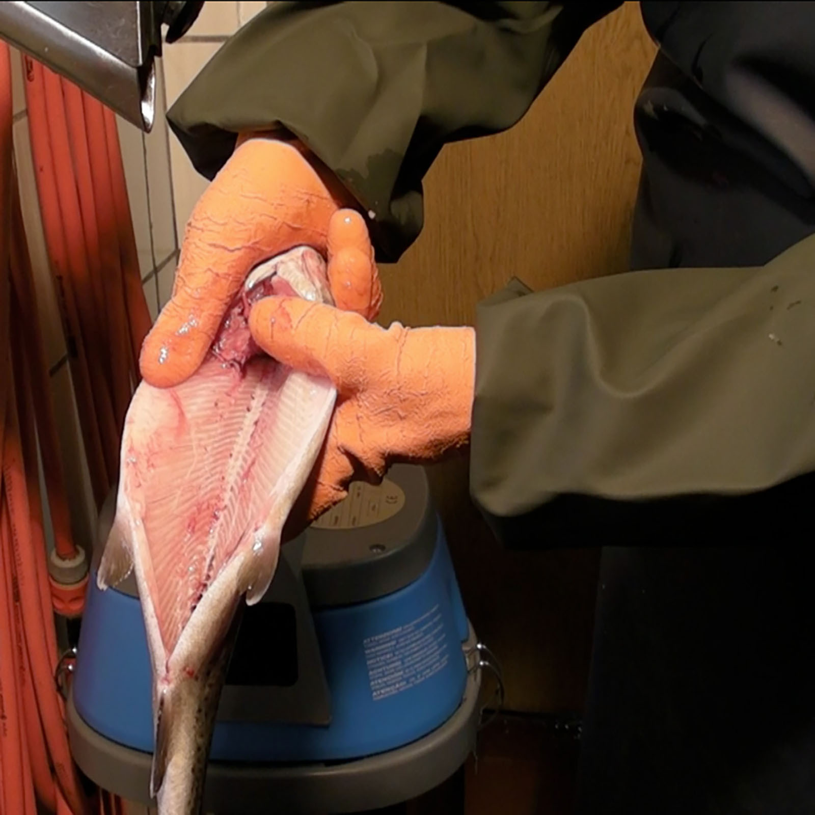 Der Fisch (200–1.300 g) wird dabei durch ein präzises Messer geöffnet und anschließend über einen speziell geformten Entnahme­kopf vollständig von allen Innereien befreit – inklusive der schwer zugänglichen Nieren.