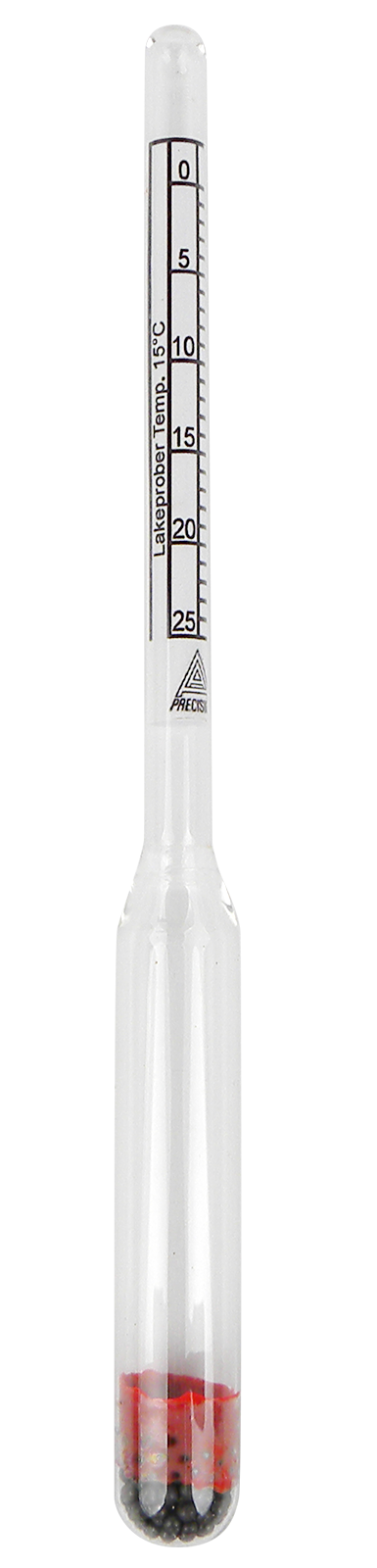 Lakemesser zur Bestimmung des Salzgehaltes im Salzbad. 0-25°Be (Grad Baumé). 180 mm lang.Die Doppelskala zeigt den Salzgehalt in °Be an und hat weiterhin folgende empfohle Makierungen: