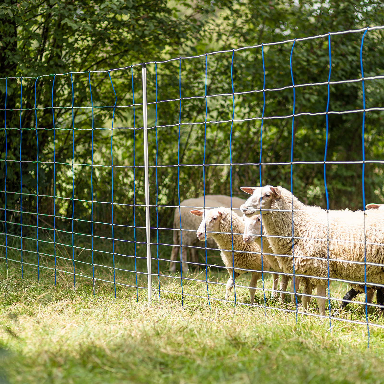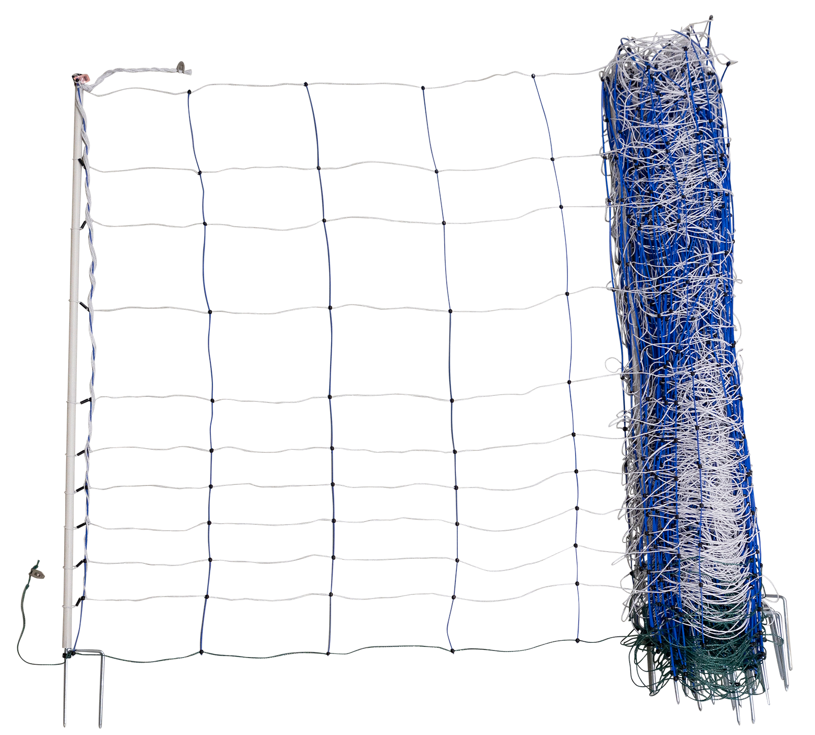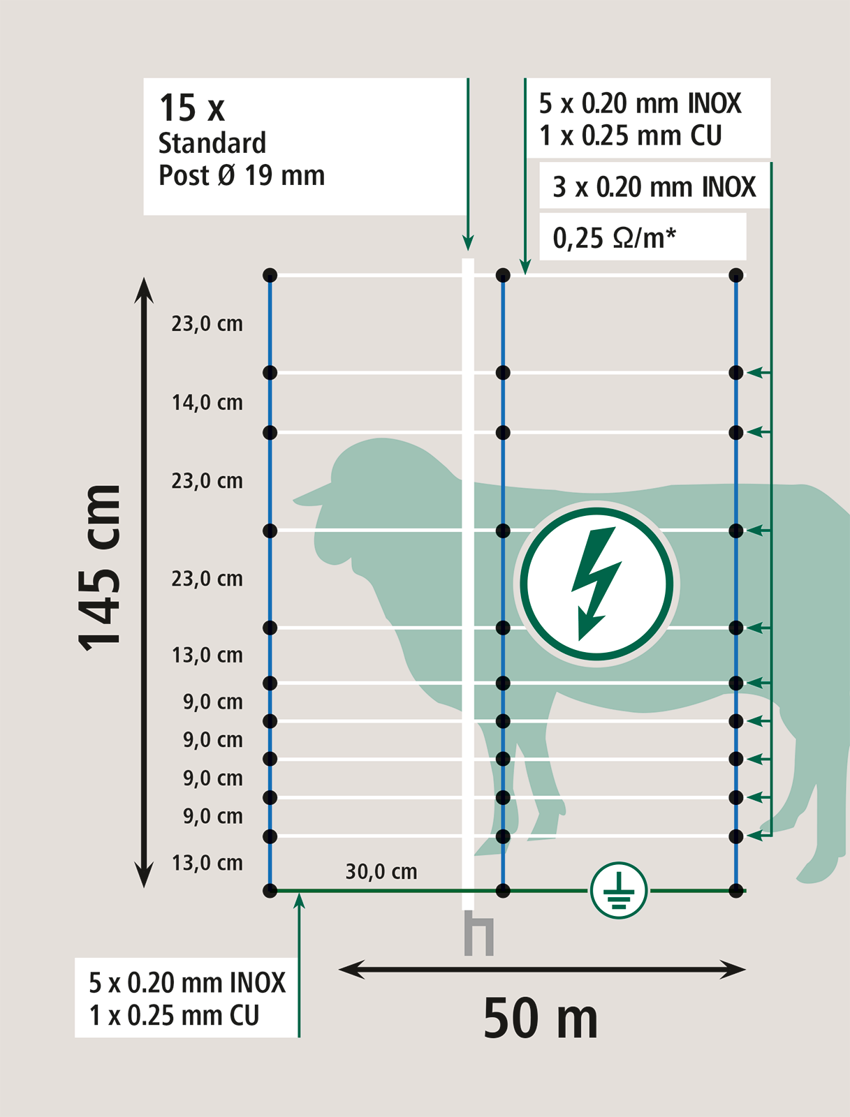 145 cm extra hohes Wolfsabwehrnetz für Schafe und Ziegen.Mit vertikalen Kunststoffstreben für optimalen Stand auch in unebenem Gelände. Mit optional anschließbarer, verstärkter Bodenlitze zur Erdung über die gesamte Netzlänge bei schwierigen Bodenverhältnissen (z.B. sehr sandigeoder trockene Böden).Mit 9 x TriCond Reihen à 3 x 0,30 mm.15 integrierte weiße Kunststoffpfähle Ø 19 mit verzinkter Bodenspitze (Doppelspitze).