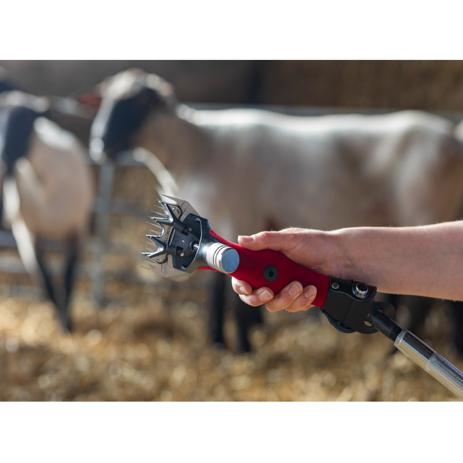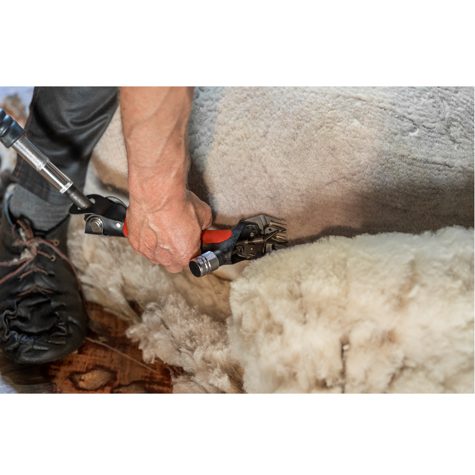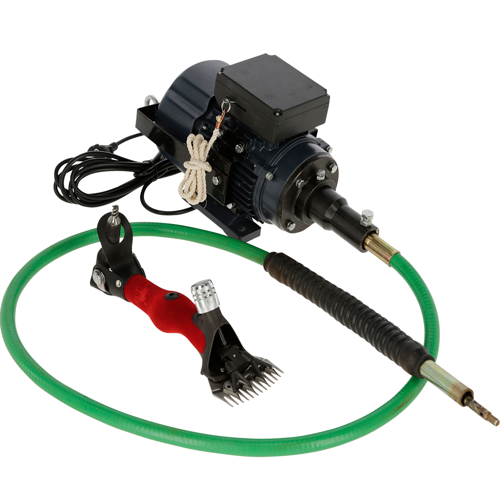 Einstufige Schafscheranlage mit Worm-Drive-Antrieb. 230 Volt, 370 Watt, ca. 2.800 Hübe/min. Geräuschpegel ca. 72 dB(A). Lieferumfang: Schafschuranlage (Antriebseinheit), flexible Biegewelle ca. 1.700 mm, Handstück (Schermaschine), 2 Messersatz (13/4 Zähne)