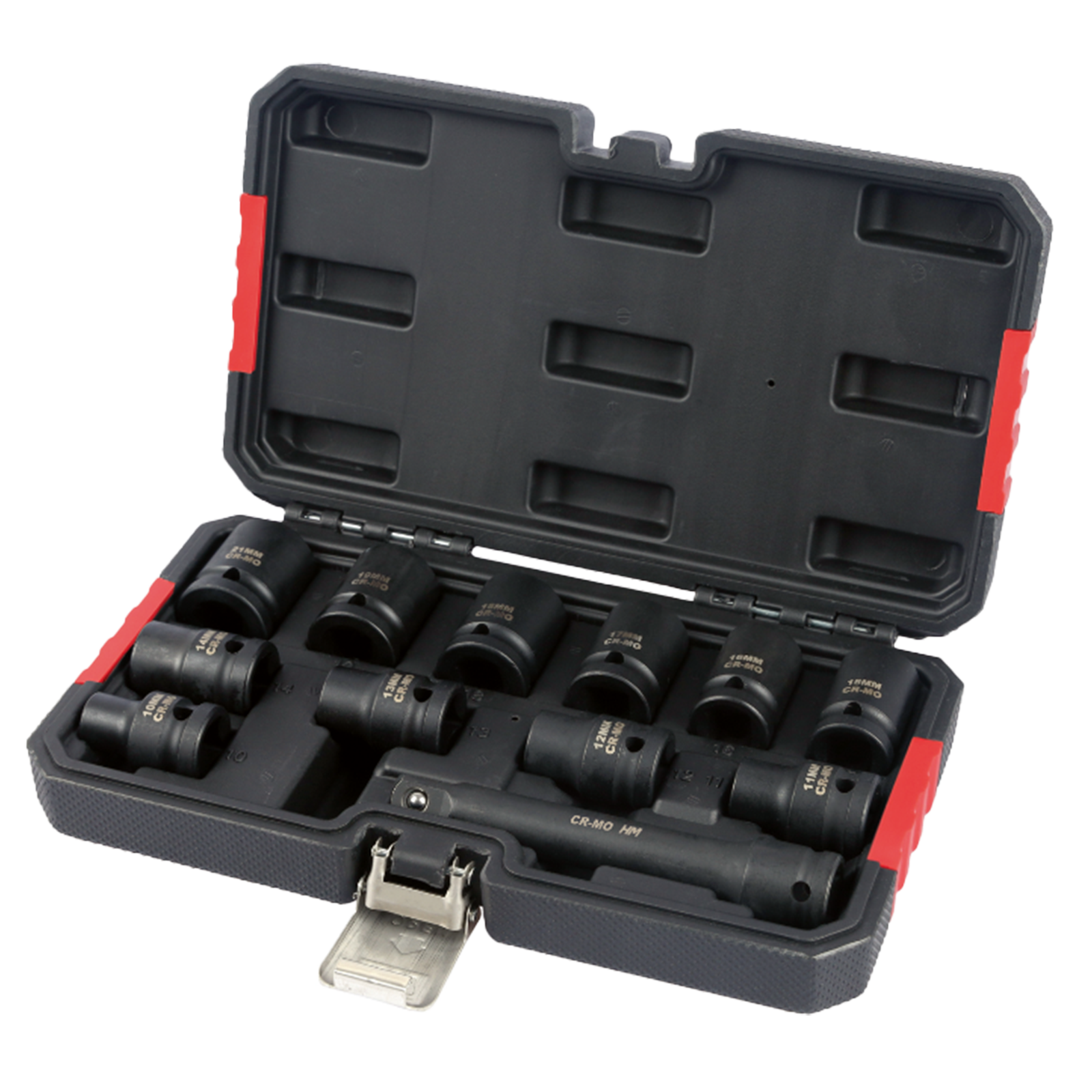 Kraft - Stecknüsse auf Chrom - Molybdän - Stahl für Hand oder Maschineneinsatz. 1/2 Zoll Vierkantantrieb für jeden handelsüblichen Schlagschrauber.Inhalt: je ein Stück Steckschlüssel: 10, 11, 12, 13, 14, 15, 16, 17, 18, 19 und 21 mm.In stabiler Kunststoffkassette.