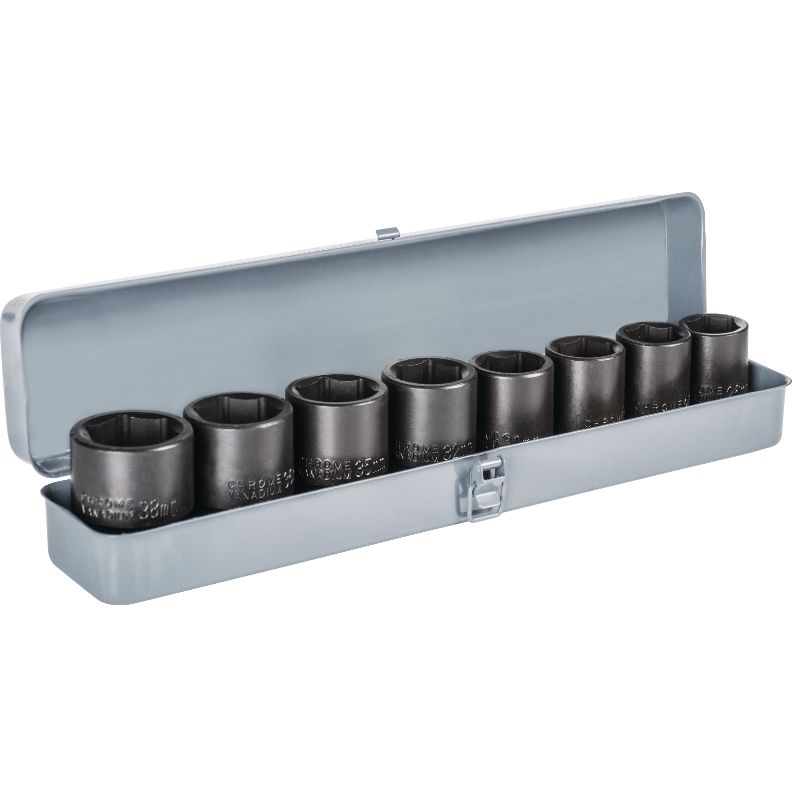 Gehärtete Spezialnüsse 3/4″ in Stahlblech-Box in den Größen 26, 27, 29, 30, 32, 36, 38.