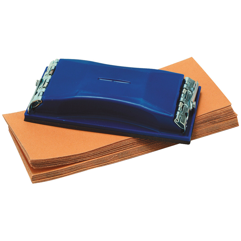 Praktischer Schleifklotz mit 210x105 mm Größe. Einfache Befestigung mit Klemmleiste. Komplett-Set mit je 12 Stück passenden Schleifblättern K60, 80 und 120.