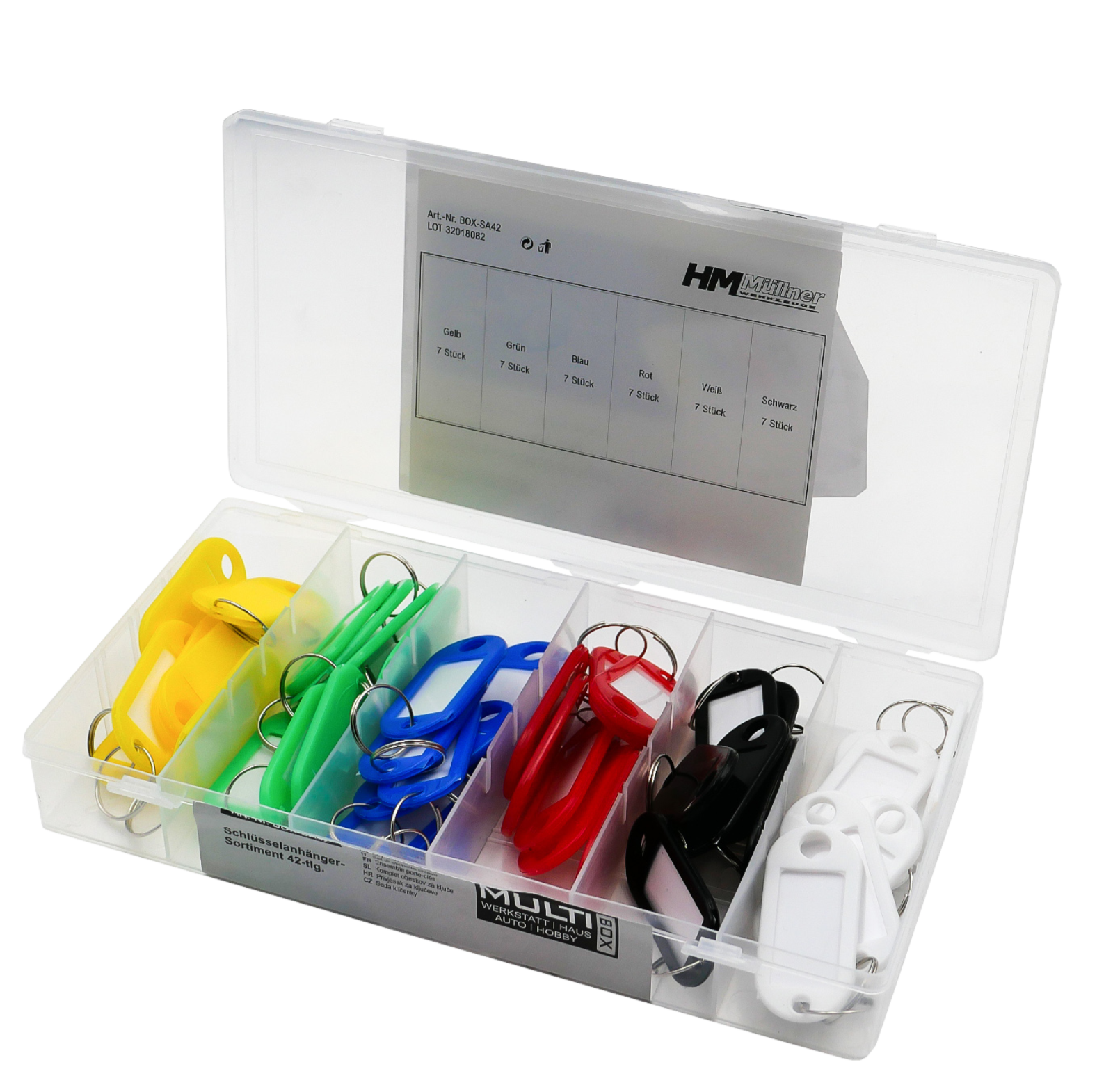 aus Kunststoff mit Schlüsselring, 6 Farben und auswechselbare Beschriftungsetiketten ermöglichen eine eindeutige Zuordnung der Schlüssel mit Anhängerloch,