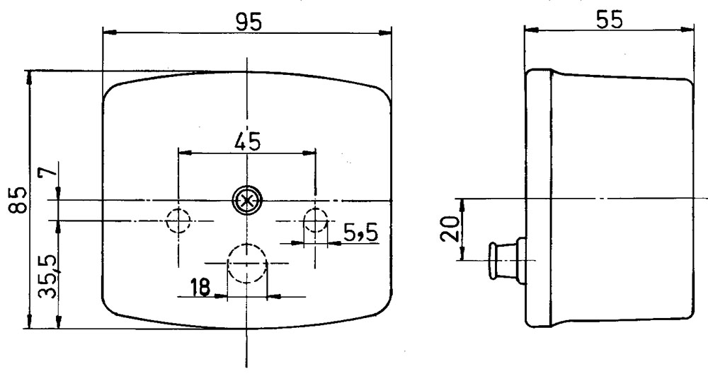 Zweikammerleuchte, Grundplatte aus Kunststoff, Schraubbefestigung, 2 Bohrungen 5mm, Lochabstand 45mm, LxBxH: 95x85x55mm