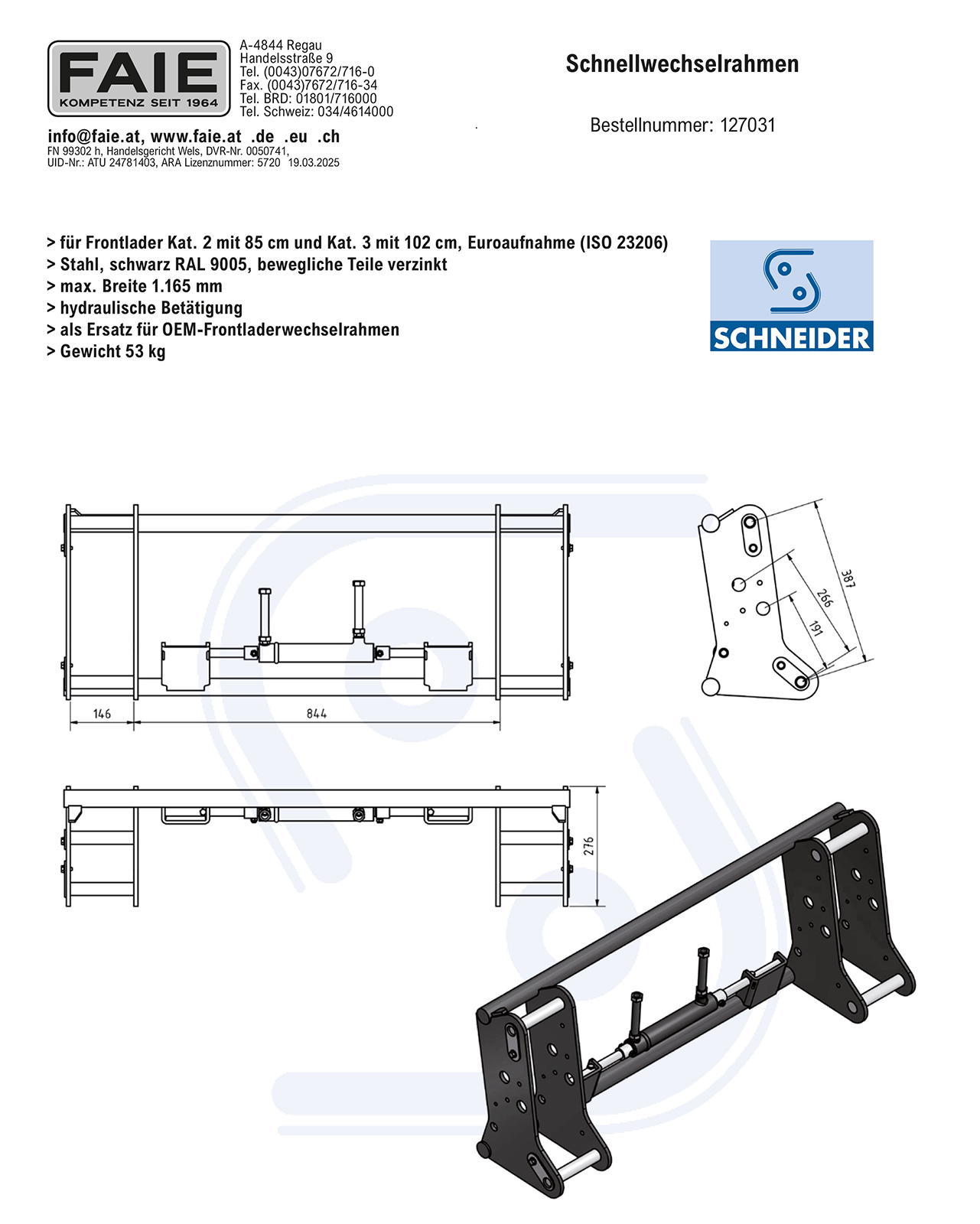 Einfaches und schnelles An- und Abkuppeln für Arbeitsgeräte am Frontlader der Kategorie 2 (85 cm) und 3 (102 cm). Die oberen Aufnahmebolzen ermöglichen durch Umstecken eine individuelle Kippwinkelverstellung. Weiters verfügt der Schnellwechselrahmen über eine hydraulische Verriegelung. Die Hydraulikschlauchleitungen mit einer Länge von 1,5 m sind im Lieferumfang enthalten. Die Leitungen haben einen Anschluss mit einer M18x1,5 mm Überwurfmutter - 12L-Anschluss. Aufnahmebolzen frontladerseitig 30 mm, Aufnahmewelle geräteseitig 40 mm, Anbaubreite der Frontladerschwinge Innen minimal 855 mm und außen max. 1120 mm, Verriegelungsbolzen-Ø 20 mm, Gesamtbreite 1165 mm, Gewicht 53 kg. Bei einem Lastschwerpunkt von 800 mm beträgt die Tragkraft ca. 3000 kg.Der Schnellwechselrahmen ist als Ersatz für OEM-Frontladerwechselrahmen geeignet.