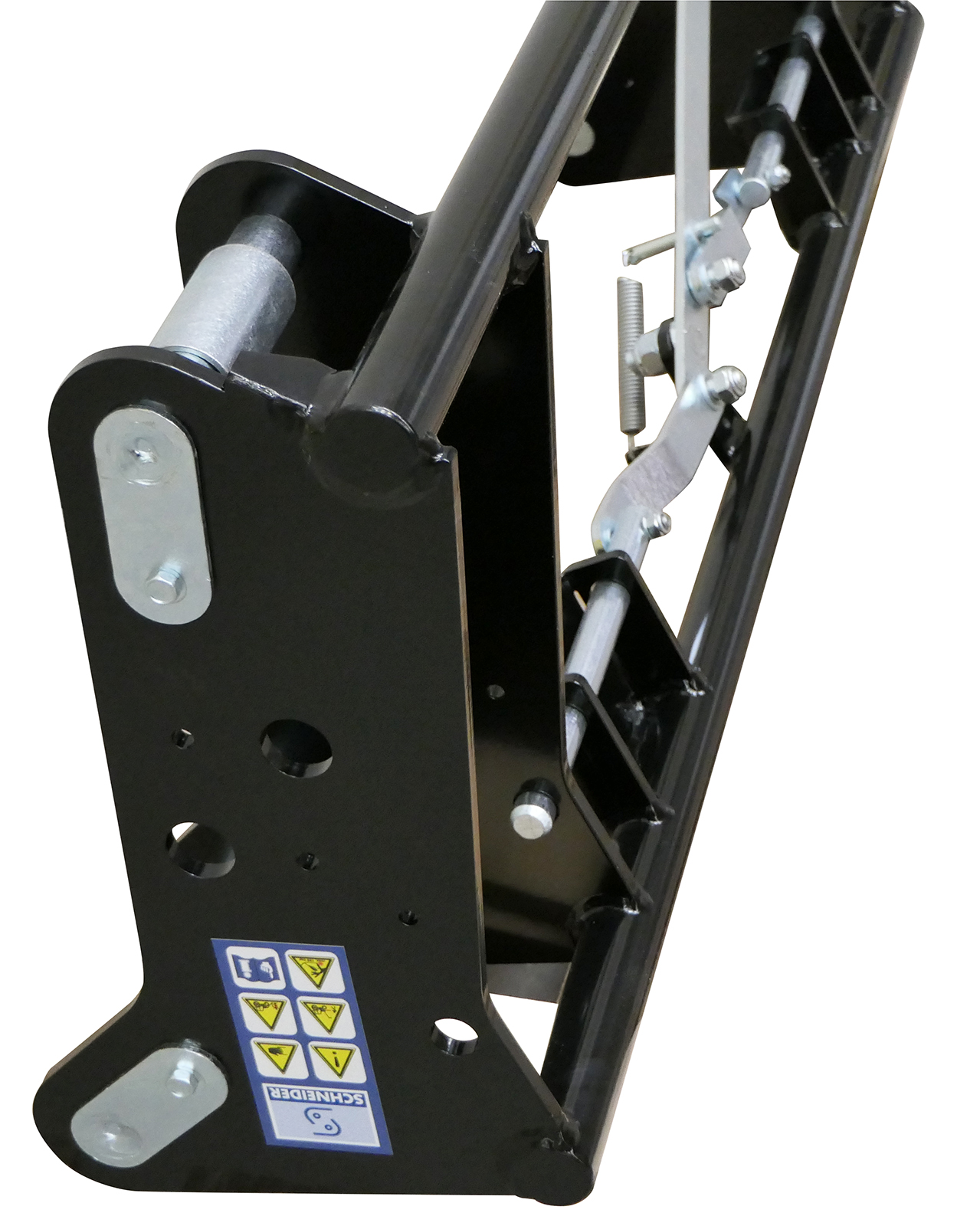 Einfaches und schnelles An- und Abkuppeln für Arbeitsgeräte am Frontlader der Kategorie 2 (85 cm) und 3 (102 cm). Die oberen Aufnahmebolzen ermöglichen durch Umstecken eine individuelle Kippwinkelverstellung. Weiters verfügt der Schnellwechselrahmen über eine mechanische Zentralverriegelung. Aufnahmebolzen Frontladerseitig 30 mm, Aufnahmewelle geräteseitig 40 mm, Anbaubreite der Frontladerschwinge Innen minimal 855 mm und außen max. 1120 mm, Verriegelungsbolzen-Ø 20 mm, Gesamtbreite 1165 mm, Gewicht 57 kg. Bei einem Lastschwerpunkt von 800 mm beträgt die Tragkraft ca. 3000 kg. Der Schnellwechselrahmen ist als Ersatz für OEM-Frontladerwechselrahmen geeignet.