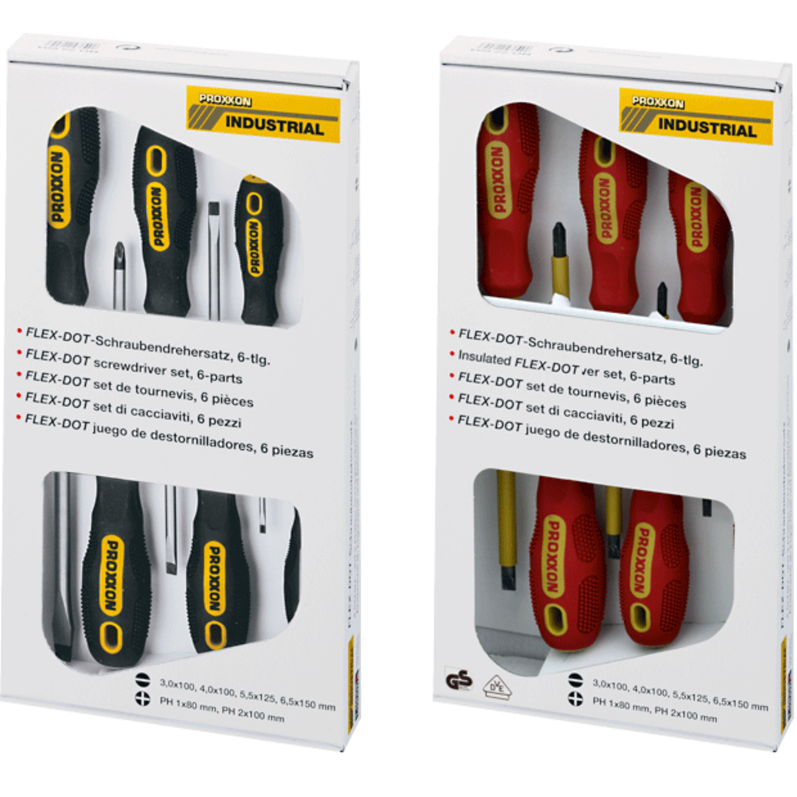 Zusammenstellungen, die in keiner Werkzeugkiste fehlen sollten. Eine vollständige Erstausrüstung für Monteure und Servicetechniker.Ergonomisches Design für gutes Arbeiten: Gerundete Zwei-Komponenten-Griffform mit flexiblen Noppen FLEX-DOT® für ermüdungs- und schmerzfreies Arbeiten. Gute Griffigkeit bei schnellem Umgreifen. Hohe Drehmomente und Andruckkräfte durch ausbalanciertes Design für horizontalen und vertikalen Ansatz.Öl- und säurebeständiger Spezialgummigriff, der nicht verklebt.Fingermulden für mehr Grip beim Schnelldrehen.Deutliche Größenangaben durch Lasermarkierung auf matt-verchromten Schäften aus Chrom-Silicium-Mangan- Molybdän legiertem Spezialstahl.Bearbeitete schwarze Spitze für höchste Präzision bei der Schraubenaufnahme. Vermindert das Abrutschen des Werkzeuges.Lieferung in Rot oder Schwarz