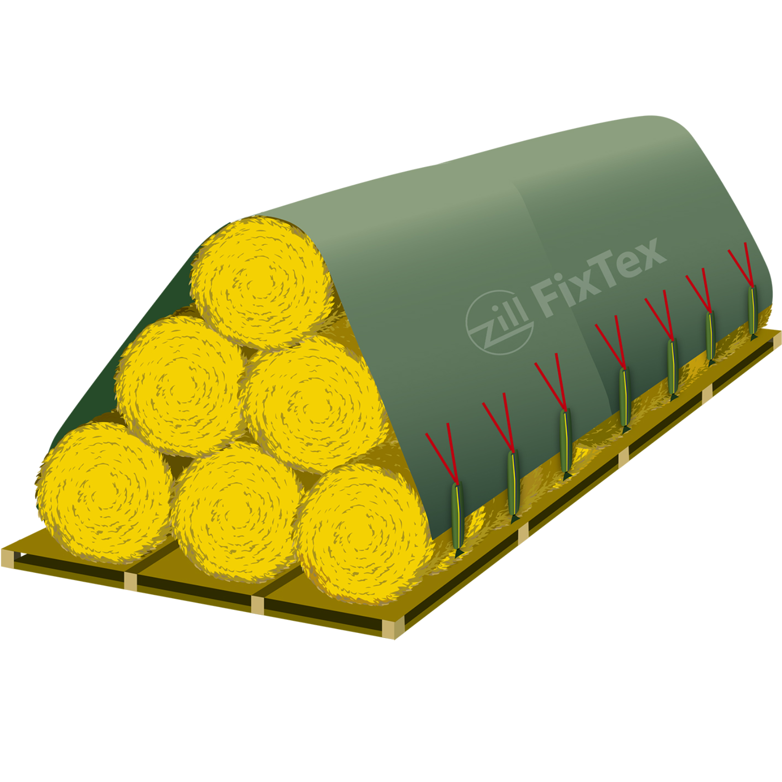 Die clevere Befestigung: um ein Vlies auf den Ballen zu fixieren kann man es mit FixTex und Silosäcken mühelos beschweren.Das FixTex mit einseitigem Klett ist dazu perfekt geeignet.Einfach ein ca. 1 Meter langes FixTex-Band in Form eines Vs mit den Klettflächen auf dem Vlies anbringen,den FixTex Silosack-Karabiner durch die Schlaufe eines gefüllten Silosacks ziehen und an das angeklettete FixTex klicken.So können die Silosäcke einfach wieder abgenommen und das Vlies samt FixTex eingelagert werden.Bei Wiederverwendung können die Silosäcke dann schnell und einfach wieder eingehängt werden.So bleibt die Haftkraft des FixTex länger erhalten und das Vlies wird dadurch geschont.Breite: 50 mmRolle: 25 m