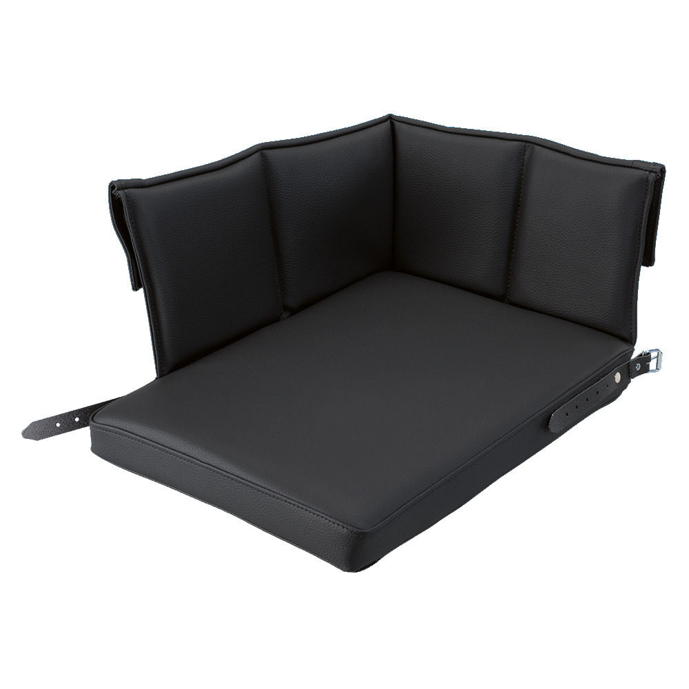 Kunstleder schwarz, BxTxH: 36 x 50 x 26 cm. Lehne mit umlaufendem Klettverschluss für perfekten Halt sowie 3 Lederschlaufen für die Befestigung. Möglichkeit einer Fuß-Wadenverlängerung mit Klettverschluss.