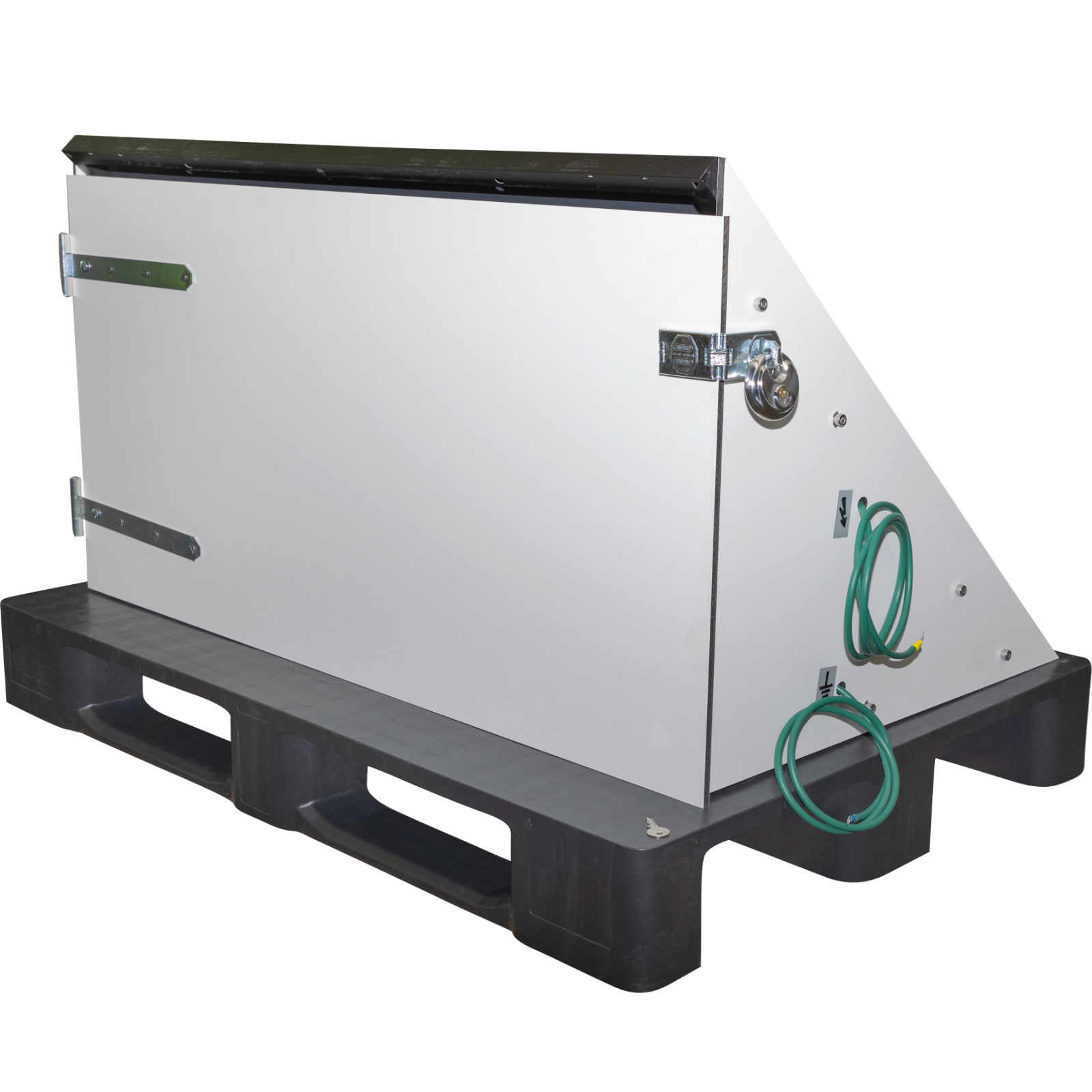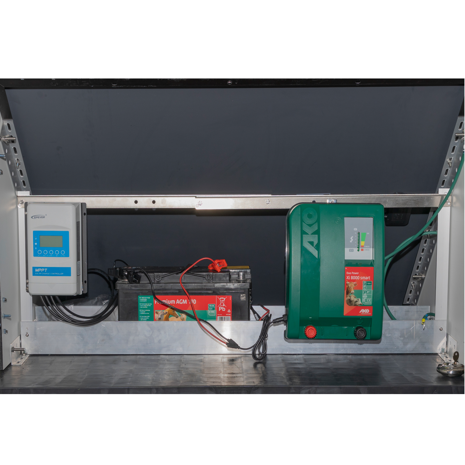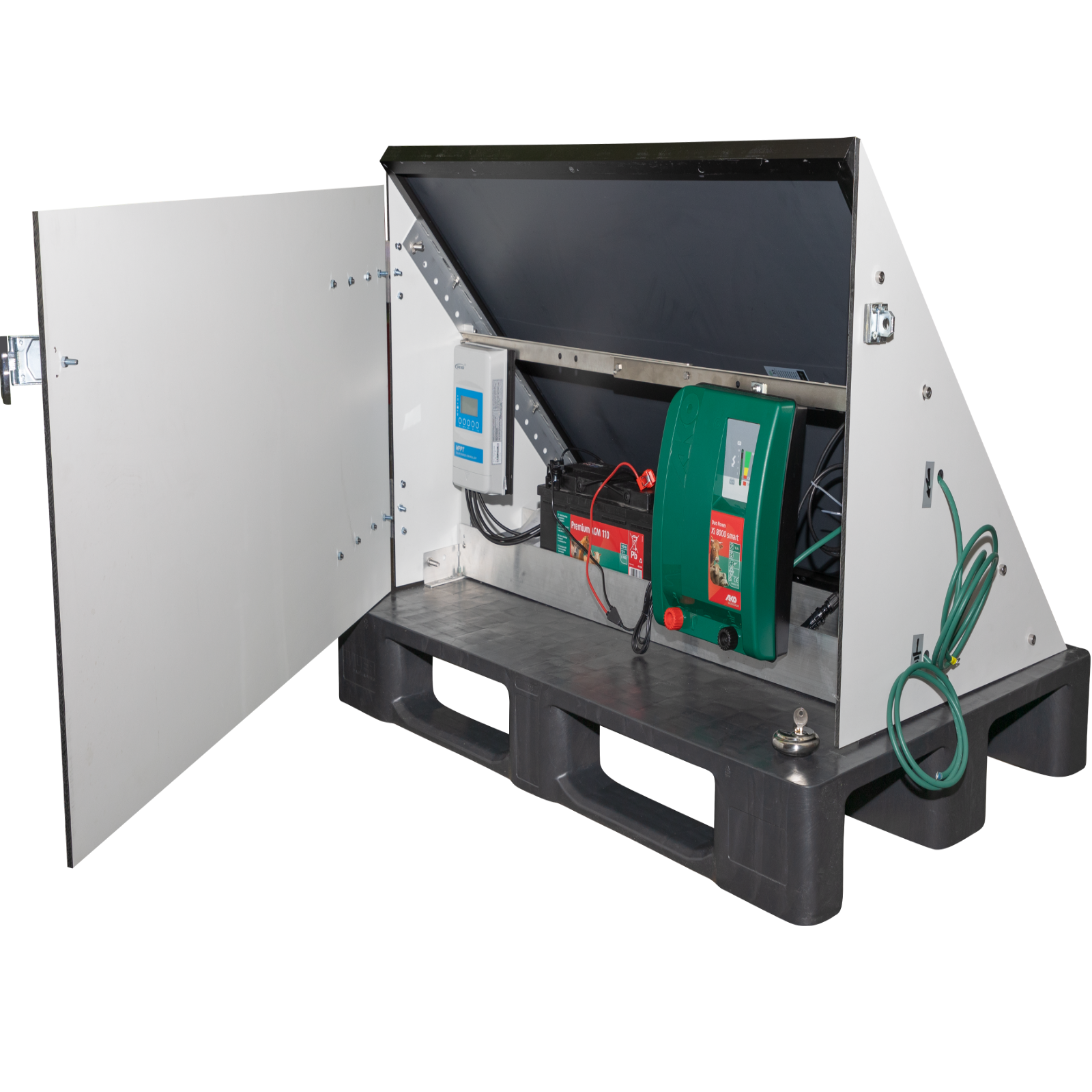 Komplette Solarstation. Ideal für große Weiden ohne Stromanschluss oder auf der Alm. Die komplette Anlage wird fertig montiert auf einer Palette geliefert und muss nur noch mit der Erdung und dem Zaunverbunden werden.