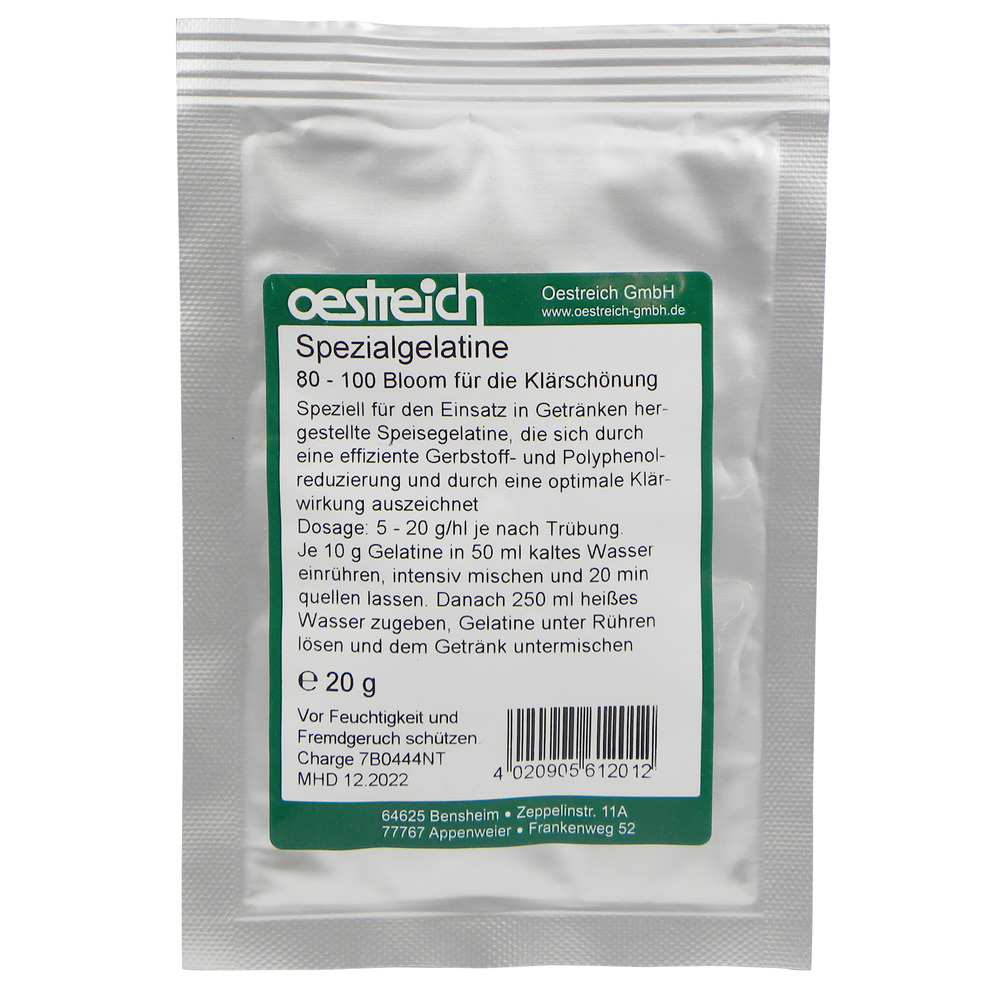 Speziell für den Einsatz in Getränken hergestellte Speisegelatine, die sich durch eine effiziente Gerbstoff- und Polyphenolreduzierung und durch eine optimale Klärwirkung auszeichnet.Dosage: 5-20 g/hl je nach Trübung