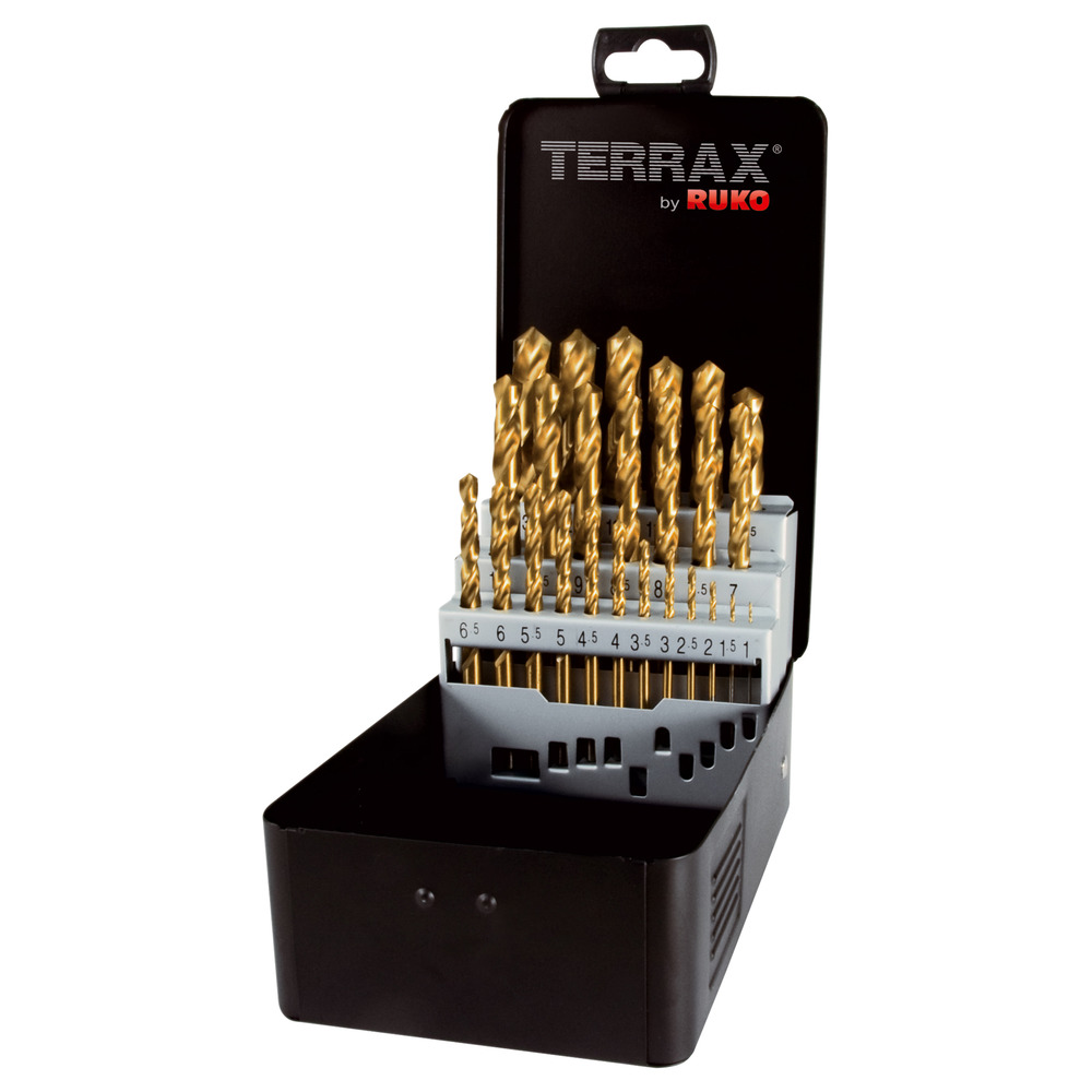 Hochwertige DIN 338 Typ N Bohrer aus dem Haus Rukko/Terrax mit TiN-Beschichtung für hohe Bohrleistung und längere Einsatzzeit.