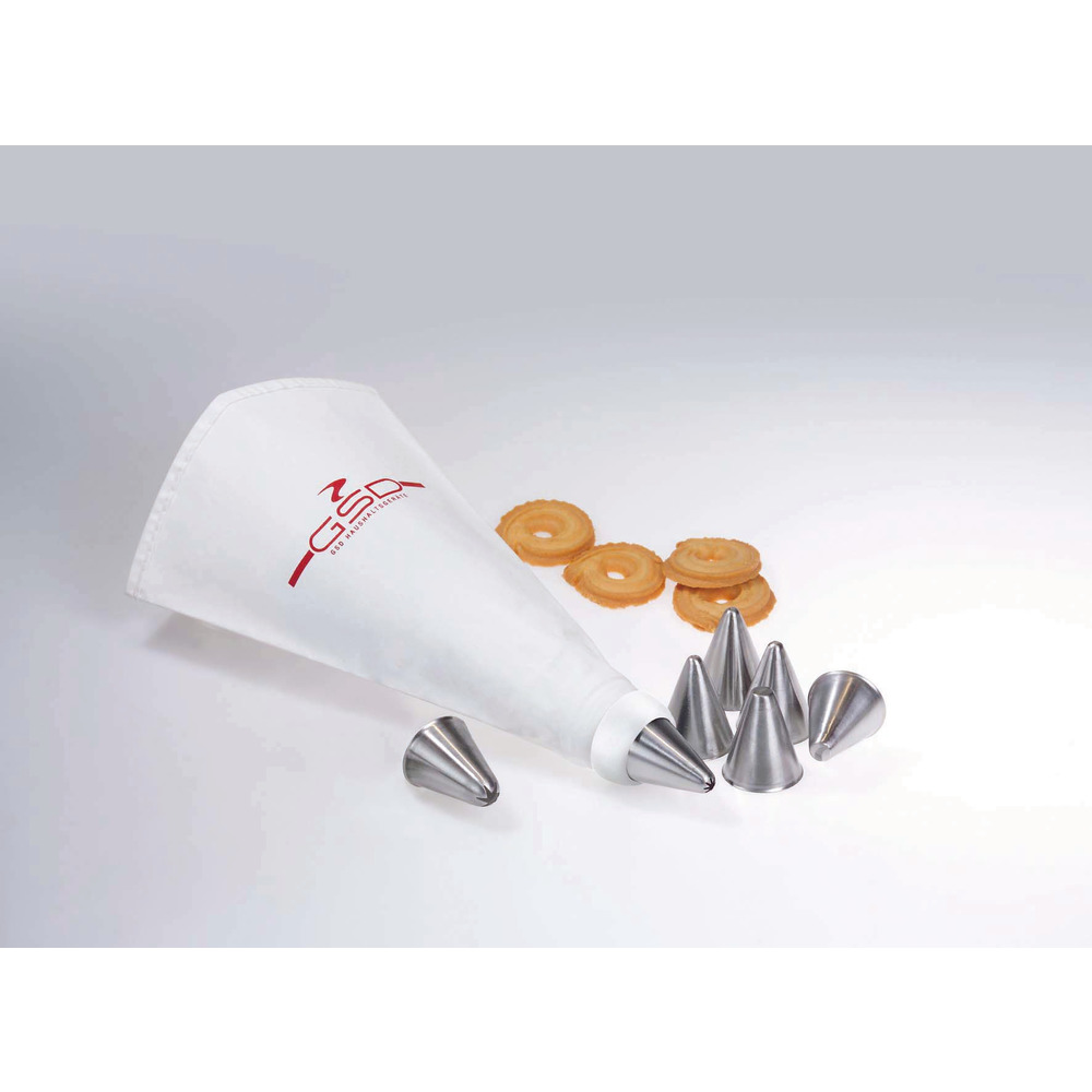 Spritzbeutel aus Baumwolle beschichtet und kochfest, mit 7 Edelstahl-Garniertüllen und mit Tüllen-Ansatzstück, um die Tüllen bei gefülltem Spritzbeutel wechseln zu können.
